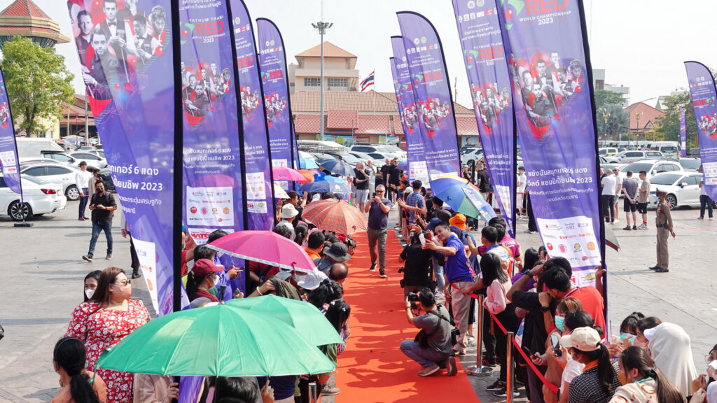 บรรยากาศแฟนนักสนุกเกอร์ยืนตั้งแถวต้อนรับนักสนุกเกอร์ที่จะร่วมในการแข่งขันปทุมธานี 6 แดง ชิงแชมป์โลก 2023 “Pathum Thani 6 Red World Championship 2023” ชิงถ้วยพระราชทาน พระบาทสมเด็จพระปรเมนทรรามาธิบดีศรีสินทรมหาวชิราลงกรณ พระวชิรเกล้าเจ้าอยู่หัว มีนักสนุกเกอร์อาชีพชื่อดังของโลก ประกอบด้วย สตีเฟน แม็คไกวร์, รอนนี่ โอซุลลิแวน, จัดด์ ทรัมพ์, มาร์ค เซลบี้, จอห์น ฮิกกินส์, มาร์ค วิลเลียมส์, ฌอน เมอร์ฟีย์, แบรี่ ฮอว์กินส์, ลูก้า บรีเซล, สจ๊วต บิงแฮม, มาร์ค อัลเลน, โฮเซน วาเฟย์, ริคกี้ วอลเด้น, อาลี คาร์เตอร์, จิมมี่ โรเบิร์ตสัน, คริส เวคลิน, จาง อันตะ, ติง จนฮุย, เคน โดเฮร์ตี้, จิมมี่ ไวท์, อองเดรส์ เปตรอฟ, มาห์มูด แอล ฮารี่ดี้ และ สแตน มูดี้ พร้อมด้วย 8 สอยคิวตัวแทนประทศไทย ประกอบด้วย “หมู ปากน้ำ” นพพล แสงคำ, “เอฟวัน” เทพไซยา อุ่นหนู, “แจ็ค สระบุรี” เดชาวัต พุ่มแจ้ง, “มิ้ง สระบุรี” ณัชชารัตน์ วงศ์หฤทัย,”นุ้ก สงขลา” กฤษณัส เลิศสัตยาทร, “นุ๊ก คอนหวัน” ปรมินทร์ ด่านจิรกุล, “ต๋อง ศิษย์ฉ่อย” วัฒนา ภู่โอบอ้อม และ “ซันนี่ สายล่อฟ้า” อรรคนิธิ ส่งเสริมสวัสดิ์