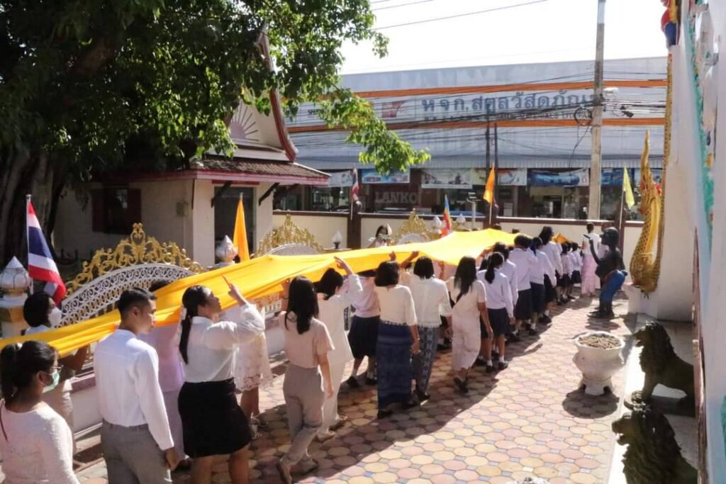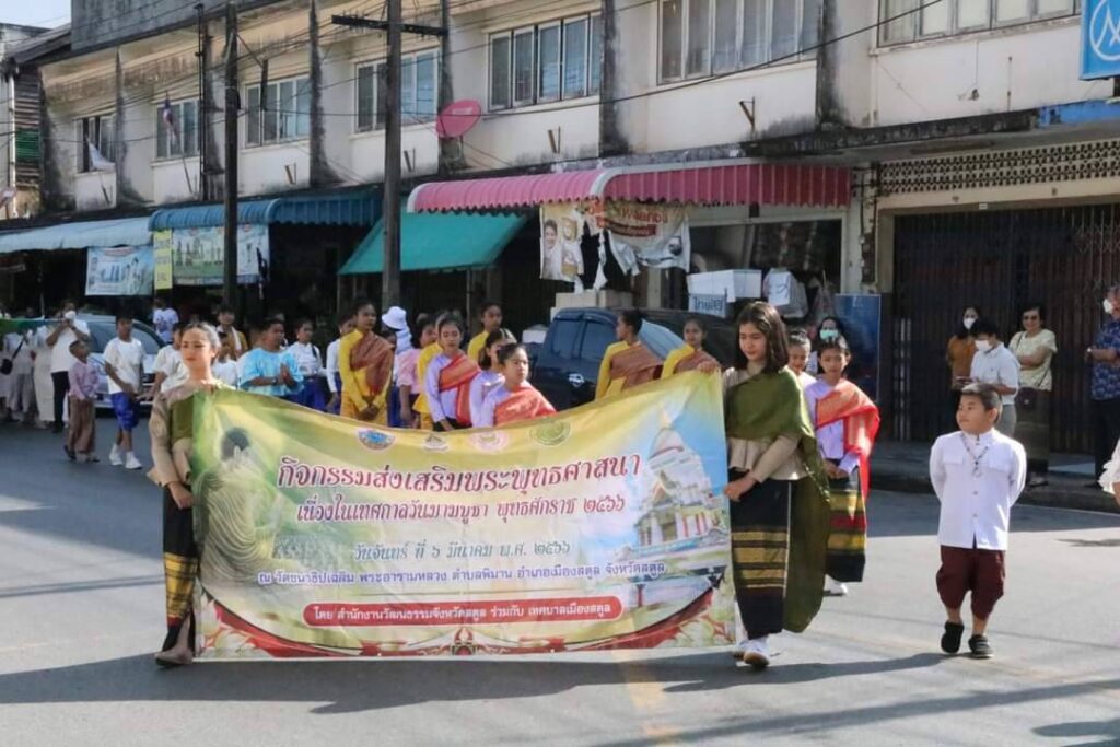 วันนี้ 6 มี.ค. 66 จังหวัดสตูล โดยสำนักงานวัฒนธรรมจังหวัดสตูล จัดพิธีแห่ผ้าขึ้นห่มพระบรมธาตุเจดีย์ศรีเมืองใต้ ณ วัดชนาธิปเฉลิม พระอารามหลวง อ.เมืองสตูล จ.สตูล เพื่อร่วมสืบสานประเพณีวันสำคัญทางพระพุทธศาสนา เนื่องในวันมาฆบูชา ประจำปี 2566 ซึ่งมีพุทธศาสนิกชนทั้งชาวไทยพุทธ และพี่น้องชาวพม่า ได้ร่วมแห่ขบวนผ้าพระบฏ ผ้าห่มพระธาตุที่ยาวไม่ต่ำกว่า 100 เมตร จำนวน 3 ผืน มาบรรจบกัน และได้วาดเรื่องราวพระพุทธประวัติศาสนาพุทธลงบนผืนผ้าพระบฏ นอกจากนี้ยังได้ออกแห่ขบวนผ้าพระบฏรอบตัวเมืองสตูล ให้พุทธศาสนิกชนได้ร่วมกันกราบไหว้บูชาอีกด้วย โดยมีนางขนิษฐา คำจันทร์แก้ว วัฒนธรรมจังหวัดสตูล พร้อมหัวหน้าส่วนราชการนำขบวนแห่ผ้าพระบฏแห่วนรอบพระบรมธาตุเจดีย์ศรีเมืองใต้และพระอุโบสถ จำนวน 3 รอบก่อนอัญเชิญผ้าขึ้นห่มบรมธาตุเจดีย์ศรีเมืองใต้ โดยมีขบวนรำวงกลองยาวของชมรมผู้สูงอายุเทศบาลเมืองสตูล ร่วมสร้างสีสันภายในงานด้วย อย่างไรก็ตามสำหรับภาคค่ำในวันนี้ จังหวัดสตูลจะจัดพิธีเวียนเทียนเนื่องในวันมาฆบูชา ณ พระอุโบสถ วัดชนาธิปเฉลิม พระอารามหลวงด้วย