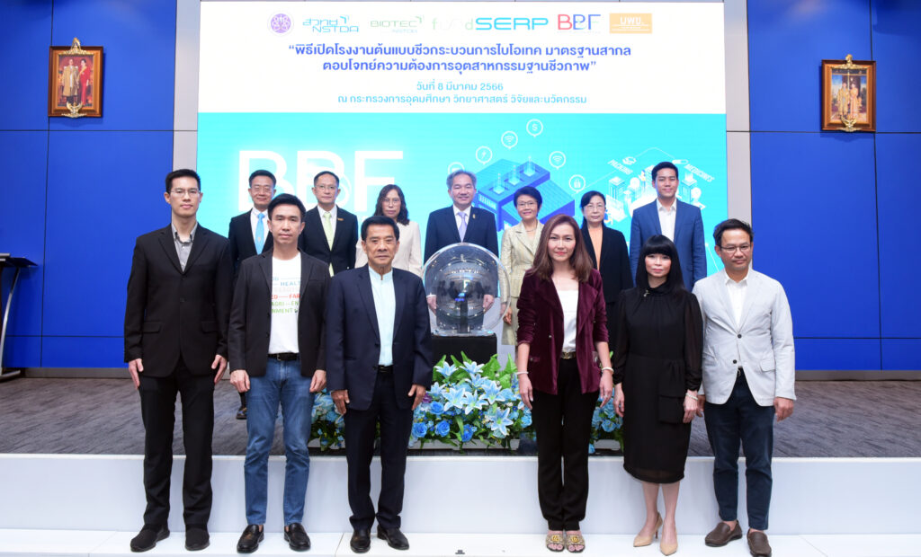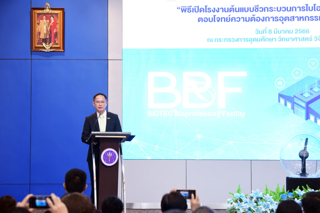 วันที่ 8 มีนาคม 2566 กรุงเทพมหานคร : กระทรวงการอุดมศึกษา วิทยาศาสตร์ วิจัยและนวัตกรรม (อว.) สำนักงานพัฒนาวิทยาศาสตร์และเทคโนโลยีแห่งชาติ (สวทช.) โดยศูนย์พันธุวิศวกรรมและเทคโนโลยีชีวภาพแห่งชาติ (ไบโอเทค) เปิดตัวโรงงานต้นแบบชีวกระบวนการไบโอเทค (BIOTEC Bioprocessing Facility) หรือ BBF ซึ่งเป็นโครงสร้างพื้นฐานที่สำคัญสำหรับการดำเนินงานวิจัยด้านการใช้ประโยชน์จากจุลินทรีย์ในระดับกึ่งอุตสาหกรรมที่ได้รับมาตรฐานระดับสากลอย่าง Codex GHPs และ HACCP รองรับการทำวิจัยร่วมกับภาคเอกชน และงานให้บริการ เพื่อตอบโจทย์ความต้องการของภาคอุตสาหกรรม และเร่งผลักดันการนำงานวิจัยไปใช้ประโยชน์เชิงพาณิชย์ ช่วยขับเคลื่อนเศรษฐกิจของประเทศ ไปสู่เป้าหมายการพัฒนาที่ยั่งยืนตามนโยบายโมเดลเศรษฐกิจ BCG