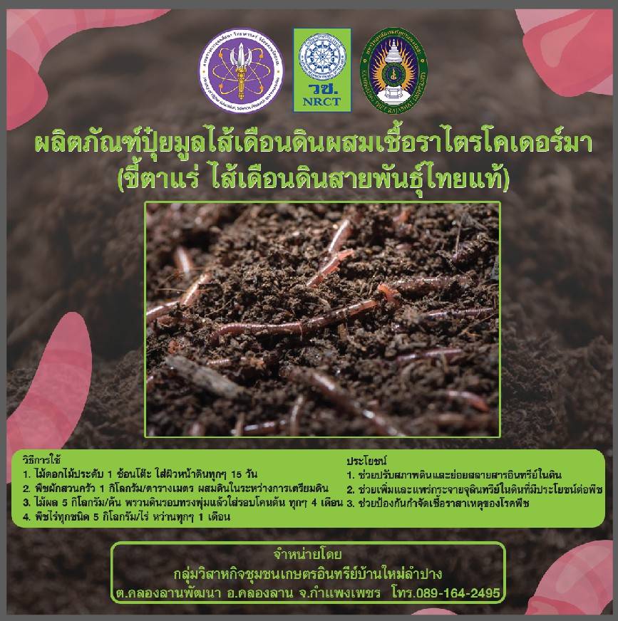 สำนักงานการวิจัยแห่งชาติ (วช.) กระทรวงการอุดมศึกษา วิทยาศาสตร์ วิจัยและนวัตกรรม (อว.) ให้การสนับสนุนทีมวิจัยจากมหาวิทยาลัยราชภัฏกำแพงเพชร ในผลงานโครงการถ่ายทอดภูมิปัญญาท้องถิ่นในการเพิ่มมูลค่าฉี่และมูลไส้เดือนดิน ตามแนวปรัชญาเศรษฐกิจพอเพียงโดยมีการสร้างศูนย์การเรียนรู้ให้กับชุมชนในการพัฒนาเสริมศักยภาพปุ๋ยอินทรีย์จากมูลไส้เดือนเพิ่มมูลค่าทางการเกษตรให้กับเกษตรกรตามวิถีธรรมชาติ อีกทั้งยังสามารถสร้างรายได้จากการนำปุ๋ยอินทรีย์มีคุณภาพไปจำหน่าย เป็นการสร้างอาชีพให้กับคนในชุมชน เกิดการพึ่งพาตนเองได้อย่างยั่งยืน ซึ่งปัจจุบันมีการขยายผลต่อยอดให้กับชุมชนท้องถิ่นจำนวน 5 แห่งในจังหวัดกำแพงเพชร และพร้อมที่จะนำองค์ความรู้ด้านเกษตรอินทรีย์จากปุ๋ยมูลไส้เดือนไปถ่ายทอดสู่ชุมชนอื่นๆ ที่สนใจ
