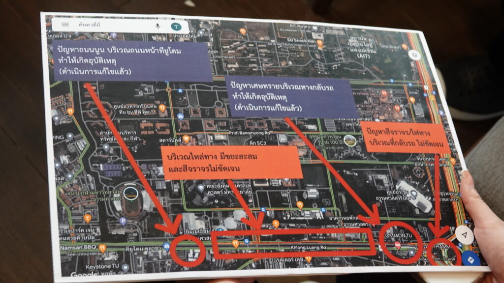 พล.ต.ท.คำรณวิทย์ ธูปกระจ่าง นายก อบจ.ปทุมธานี กล่าวว่า ครั้งนี้ไม่ใช่ครั้งแรก ซึ่งเราเคยได้รับการประสานจากน้อง ๆ นักศึกษาตั้งแต่ เหตุการณ์ มีอุบัติเหตุจนมีนักศึกษาเสียชีวิต และมีบางจุดที่อุบัติเหตุเกิดบ่อยครั้งซึ่งเกิดจากผิวถนนไม่เรียบ มีทรายที่ตกหล่นพบผิวถนนไม่มีการแก้ไข เมื่อมีน้องนักศึกษาได้ประสานมาก่อนหน้านี้เราได้แก้ไขไปได้แล้ว แต่จุดอื่น ๆ ต้องทำต่อไป บนสะพานลอยที่เคยมีขยะเต็มไปหมด ในขณะนั้น จ่ายุทธ หรือยุทธศักดิ์ ชูประเสริฐ อดีตตอนนั้นยังเป็นตำแหน่งที่ปรึกษาพิเศษนายก อบจ.ปทุมธานี รับร้องเรียนและได้ประสานงานเทศบาลเมืองท่าโขลงมาดำเนินการเรียบร้อยทั้งหมด เราอยากให้ทำอย่างยั่งยืน และบริเวณสะพานลอยที่มืด กลางคืนมีนักศึกษาต้องข้ามระหว่างมหาวิทยาลัยมายังหอพัก เมื่อมืดก็อันตรายต่อนักศึกษาที่ใช้สะพานลอย โดยต่อไปจะมีการนำไฟส่องสว่างโซล่าเซลมาติดตั้งอย่างเร่งด่วนเพื่อแก้ปัญหาให้เร็วที่สุด สำหรับการทำความสะอาดถนนให้น้องนักศึกษากำหนดมาว่าดีเดย์วันไหน ทางเทศบาลนครรังสิต เทศบาลเมืองท่าโขลง อบจ.ปทุมธานี นำรถน้ำเข้ามาร่วมกันช่วยเหลือแบ่งโซลกันทำความสะอาดร่วมกับนักศึกษา ส่วนปัญหาที่รถติดเยอะผมได้คุยกับท่านอธิการบดีไว้แล้วโดยผมมีแผนที่จะทำรถไฟฟ้าโมโนเรลแน่นอนต้องผ่านเส้นนี้ สถานีธรรมศาสตร์จะต้องมี ไปเชื่อมเส้นทางรถไฟฟ้าสีเขียวและสีแดง