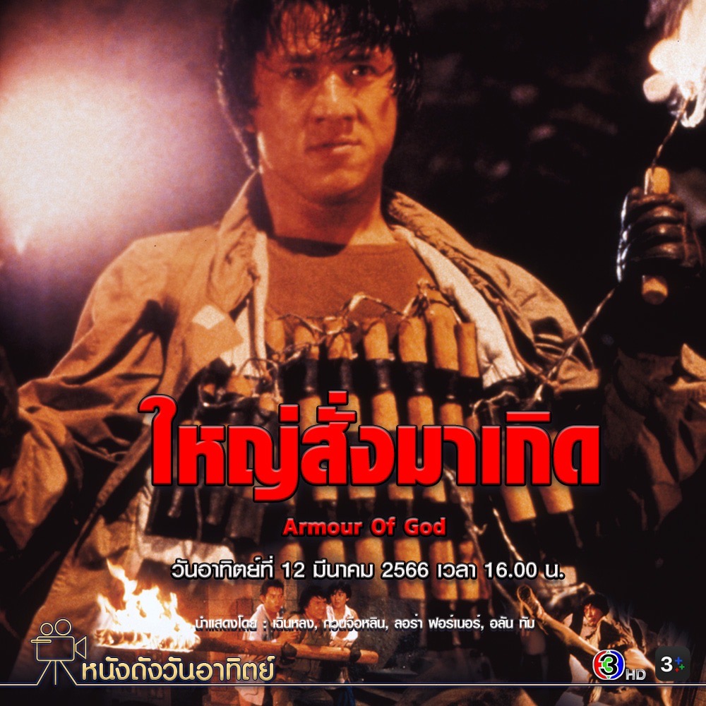 ช่วง “หนังดีวันอาทิตย์” พบกับภาพยนตร์ “Armour Of God (ใหญ่สั่งมาเกิด)” นักแสดง: เฉินหลง, อลัน ทัม, กวนจือหลิน, ลอร่า ฟอร์เนอร์ เรื่องราวกล่าวถึงนักล่าขุมทรัพย์จอมผจญภัยที่มีนามว่าแจ็คกี้ เจ้าของฉายาเหยี่ยวเอเชีย แจ็คกี้ได้ช่วยท่านดยุคค้นหาอาวุธเทพเจ้า ซึ่งในการค้นหาครั้งล่าสุด แจ็คกี้ได้ดาบศักดิ์สิทธิ์มาไว้ในครอบครอง ท่านดยุครู้สึกปลาบปลื้มเป็นอย่างมากและพร้อมที่จะจ่ายไม่อั้นเพื่อให้ได้ดาบศักดิ์สิทธิ์ชิ้นนี้มาเป็นของตน แต่เมื่อผู้ก่อการร้ายจอมโหดได้ทราบข่าวเรื่องดาบก็ได้ส่งคนมาจับตัวแฟนสาวของอลันไป ซึ่งในอดีตเธอเคยเป็นแฟนกับแจ็คกี้มาก่อน เพื่อนำมาเป็นเงื่อนไขแลกเปลี่ยนกับดาบ ท่านดยุคได้ให้แจ็คกี้ยืมดาบไป โดยมีข้อแม้ว่าเขาต้องนำอาวุธเทพเจ้าที่เหลือกลับมาให้ได้ แจ็คกี้และอลันจึงออกเดินทางไปยังยุโรป เพื่อชิงตัวหญิงสาวและนำอาวุธเทพเจ้าที่อยู่ในการครอบครองของผู้ก่อการร้ายกลับมาด้วย ติดตาม “Armour Of God (ใหญ่สั่งมาเกิด)” ได้ในวันอาทิตย์ที่ 12 มีนาคม 2566 เวลา 16.00 น.