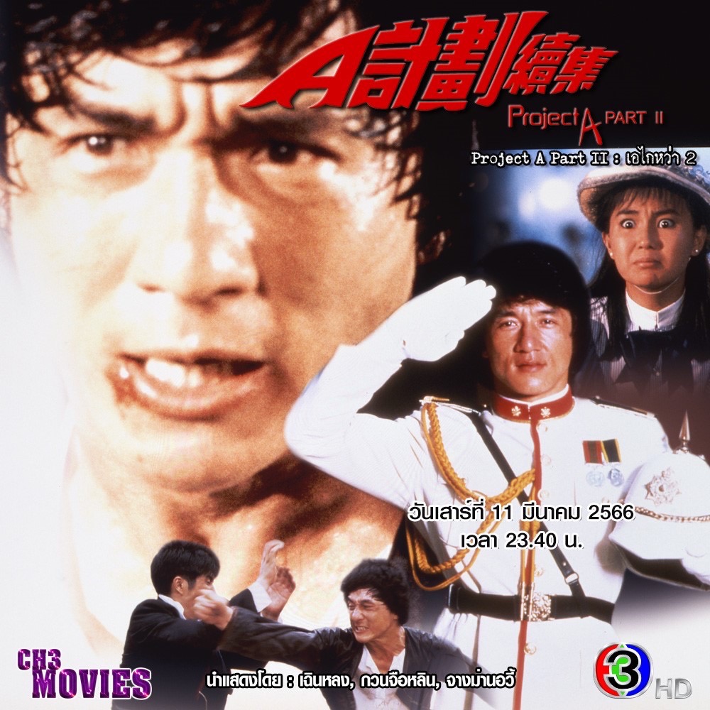 ส่วน “แชนแนลทรีมูฟวี่ส์” สัปดาห์นี้ขอนำเสนอภาพยนตร์ “เอไกหว่า 2 (Project A Part II)” นำแสดงโดย: เฉินหลง, กวนจือหลิน, จางม่านอวี้ เรื่องราวของ หม่าหยูหลง นายตำรวจชั้นผู้น้อยที่ออกมาต่อต้านพวกโจรสลัดที่ออกปล้นฆ่าในทะเล ตำรวจขี้ฉ้อ และเหล่านักการเมืองที่หากินกับตำแหน่งของตัวเองอย่างออกนอกหน้า ด้วยความหวังที่จะทำให้บ้านเมืองพบกับความสุขอย่างแท้จริงเสียที ในขณะที่ หม่าหยูหลง ต้องการออกไปกวาดล้างพวกโจรสลัดก็ต้องเจอการขัดขวางจากฝ่ายตรงข้าม หม่าหยูหลงจึงรวบรวมพวกพ้องที่เห็นด้วยกับการทำงานของตัวเองแล้วตั้งทีมขึ้นเพื่อทำงานดังกล่าว ติดตาม “เอไกหว่า 2 (Project A Part II)” ได้ในวันเสาร์ที่ 11 มีนาคม 2566 เวลา 23.40 น.