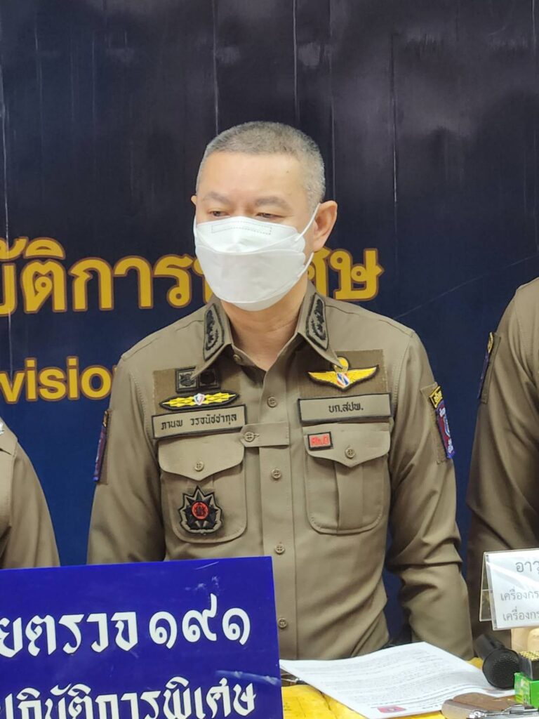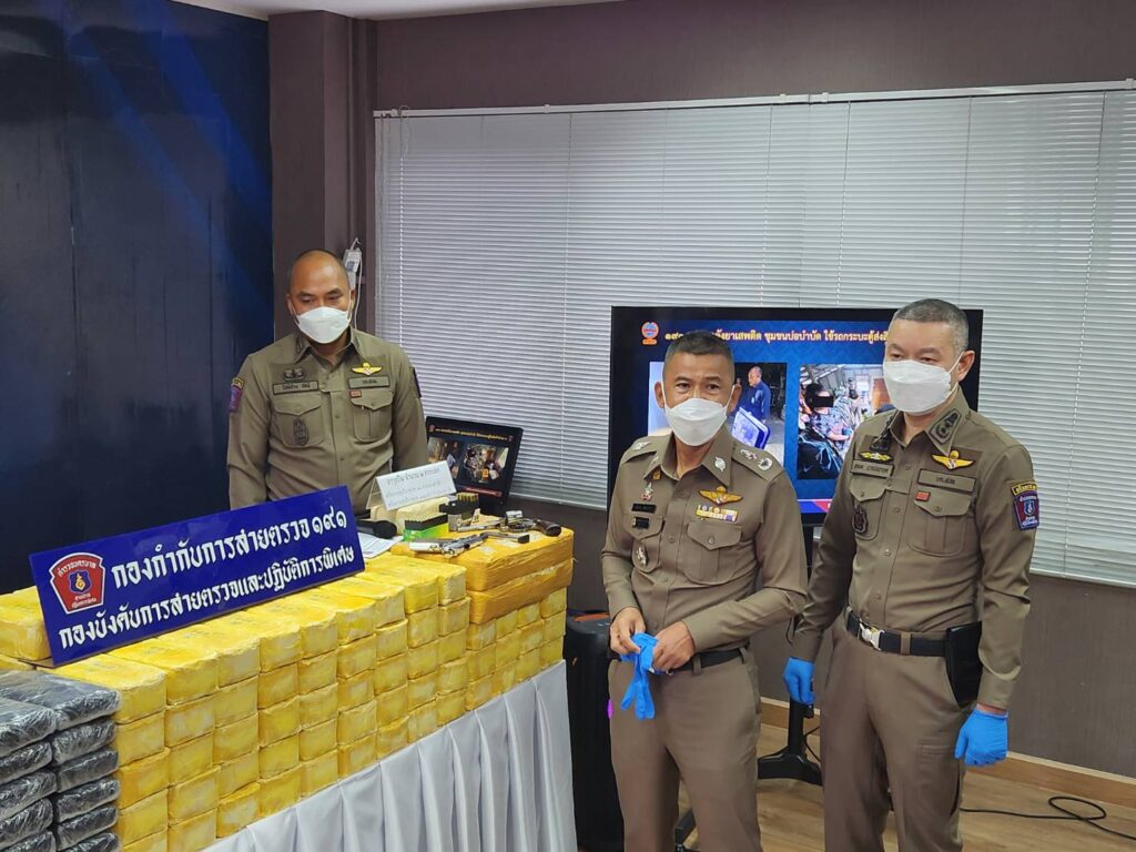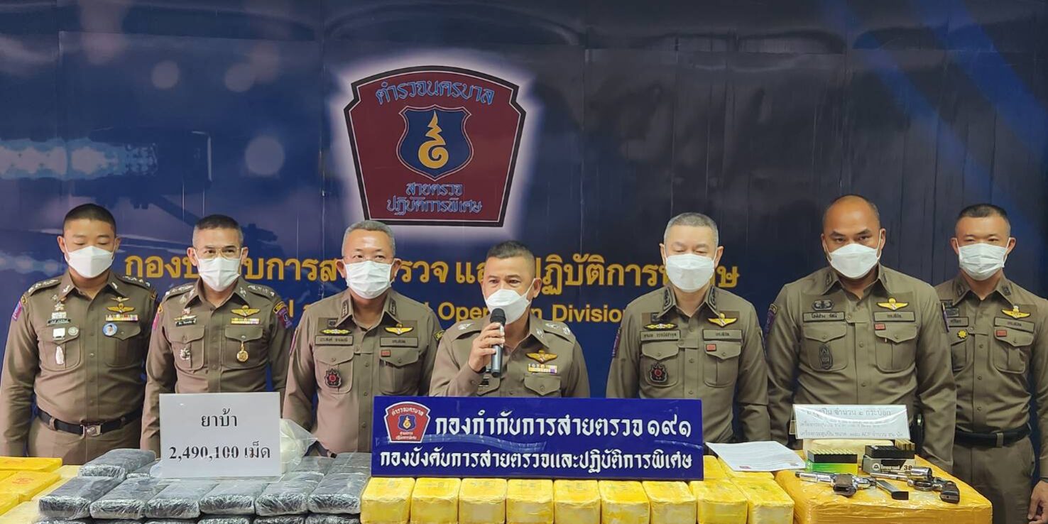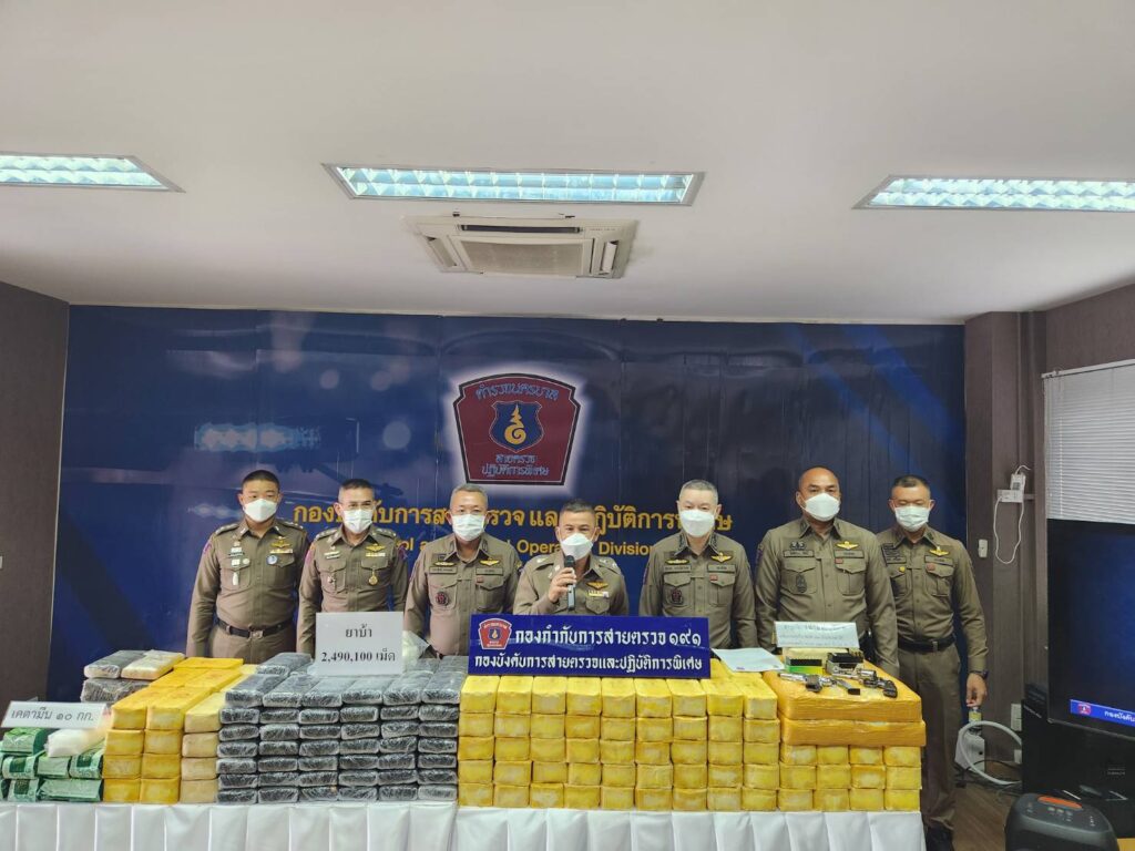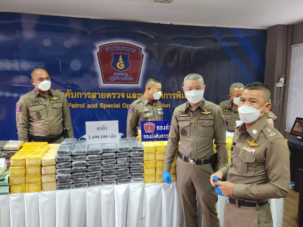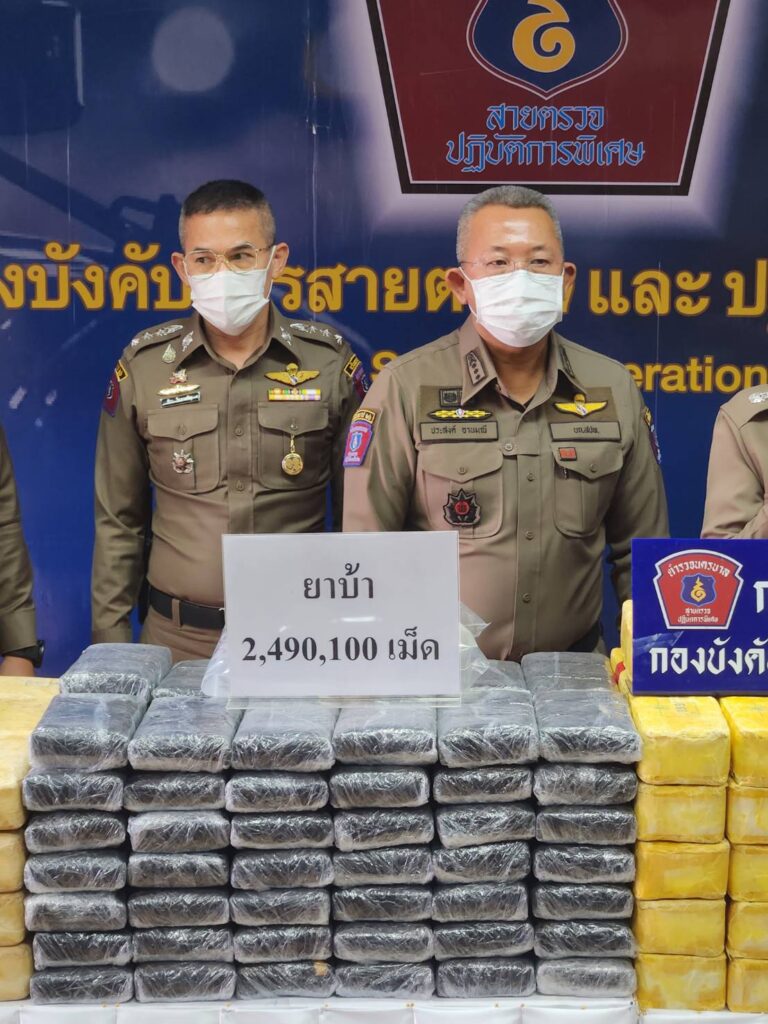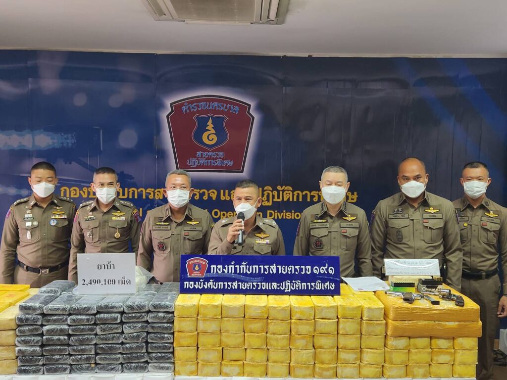 พร้อมด้วยของของกลางที่ตรวจยึดคือ ยาเสพติดให้โทษประเภท 1 (ยาบ้า) รวมจำนวนประมาณ 2,490,100 เม็ด,วัตถุออกฤทธิ์ต่อจิตและประสาทประเภท 2 (คีตามีน) รวมน้ำหนักประมาณ 10 กิโลกรัม,อาวุธปืนขนาดลูกโม่ ขนาด .38 จำนวน 1 กระบอก,อาวุธปืนออโตเมติก ขนาด .45 จำนวน 1 กระบอก,เครื่องกระสุนปืน จำนวน 67 นัด,รถยนต์กระบะตู้ทึบ จำนวน 2 คัน และโทรศัพท์มือถือ จำนวน 2 เครื่อง