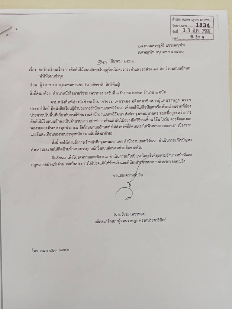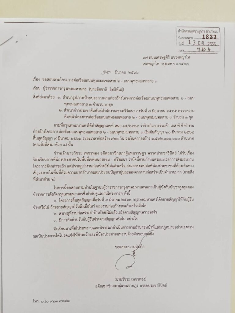 (13มี.ค.66)เมื่อเวลา 11.50 น.ที่ศาลาว่าการกทม.นายวัชระ เพขรทอง อดีต ส.ส.พรรคประชาธิปัตย์ ยื่นหนังสือกับนายชัชชาติ สิทธิพันธุ์ ผู้ว่ากทม. 3 เรื่องคือ 1.ขอสอบถามโครงการต่อเชื่อมถนนพุทธมณฑลสาย 2- ถนนพุทธมณฑลสาย 3 ตามที่กทม.ได้ทำสัญญาเลขที่ สนย.15/2564 ว่าจ้างกิจการร่วมค้า เอส พี ซี ทำงานก่อสร้างโครงการต่อเชื่อมถนนพุทธมณฑลสาย 2 – ถนนพุทธมณฑลสาย 3 เริ่มต้นสัญญา 20 มีนาคม 2564 สิ้นสุดสัญญาวันที่ 9 มีนาคม 2566 ระยะเวลาก่อสร้าง 720 วัน วงเงินค่าก่อสร้าง 1,532 ล้านบาทนั้น ปรากฏว่ามีประชาชนในพื้นที่เขตหนองแขม – ทวีวัฒนา กทม.มาร้องเรียนกับตนว่า ขณะนี้ครบกำหนดระยะเวลาการส่งมอบงานโครงการดังกล่าวแล้ว แต่งานก่อสร้างยังไม่แล้วเสร็จ ส่งผลกระทบต่อประชาชนที่ต้องเดินทางสัญจรในพื้นที่ด้วยความยากลำบากและประสบปัญหาฝุ่นละอองจากงานก่อสร้างเป็นจำนวนมาก จึงขอสอบถามผู้ว่ากทม.ที่กำกับดูแลงานโครงการฯ ดังนี้