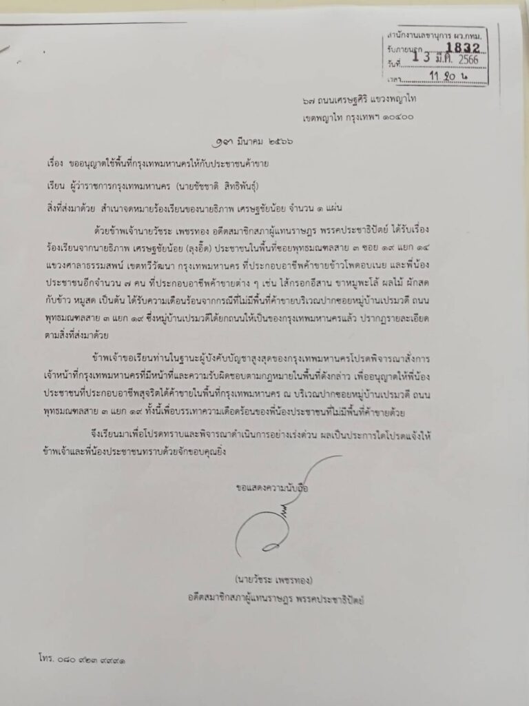 ส่วนเรื่องที่ 2. นายวัชระได้ยื่นเรื่องขออนุญาตใช้พื้นที่กรุงเทพมหานครให้กับประชาชนค้าขาย จากกรณีได้รับเรื่องร้องเรียนจากนายธิภาพ เศรษฐชัยน้อย (ลุงอิ๊ด) พักอาศัยในพื้นที่ซอยพุทธมณฑลสาย 3 ซอย 19 แยก 14 แขวงศาลาธรรมสพน์ เขตทวีวัฒนา กรุงเทพมหานคร พร้อมกับผู้ค้าอีก 7 คนที่ประกอบอาชีพค้าขายต่างๆ ได้รับความเดือนร้อนขาดรายได้ เนื่องจากไม่มีพื้นที่ค้าขายบริเวณปากซอยหมู่บ้านเปรมวดี ถนนพุทธมณฑลสาย 3 แยก 19 ซึ่งหมู่บ้านเปรมวดีได้ยกถนนให้เป็นของกรุงเทพมหานครแล้ว จึงขอให้ผู้ว่ากทม.พิจารณาสั่งการอนุญาตให้ผู้ค้าสามารถขายของได้ที่บริเวณดังกล่าวเพื่อบรรเทาความเดือดร้อนด้วย