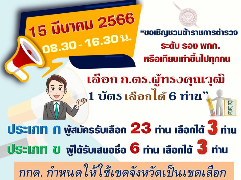 ตำรวจภูธรภาค 5 ขอประชาสัมพันธ์เชิญชวนข้าราชการตำรวจ ระดับ รอง ผกก.หรือเทียบเท่าขึ้นไปทุกคน เลือก ก.ตร.ผู้ทรงคุณวุฒิ 1 บัตร เลือกได้ 6 ท่าน ประเภท ก ผู้สมัครรับเลือก 23 ท่าน เลือกได้ 3 ท่าน และ ประเภท ข ผู้ได้รับเสนอชื่อ 6 ท่าน เลือกได้ 3 ท่าน โดยสามารถใช้สิทธิได้ตามสถานที่ที่กำหนดไว้ในแต่ละจังหวัด ในวันที่ 15 มีนาคม 2566 ในระหว่างเวลา 08.30-16.30 น.