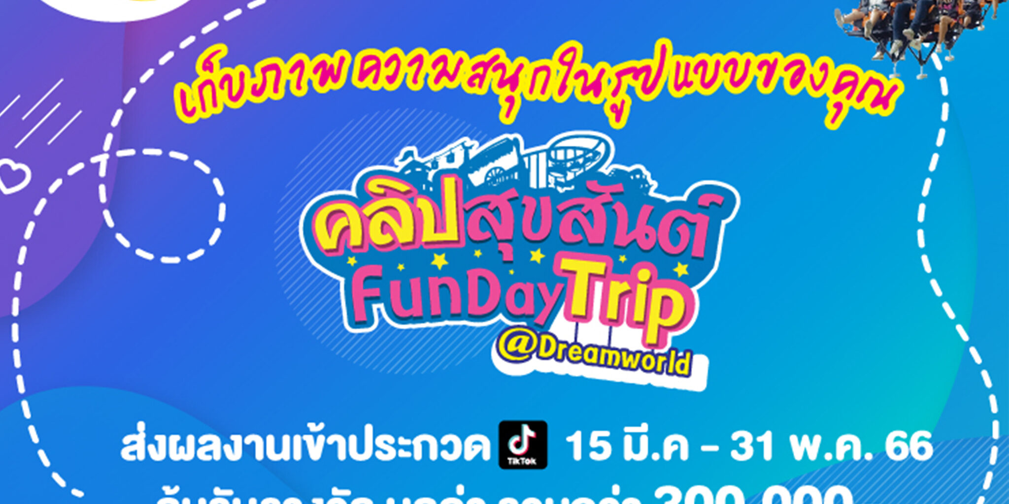 วันที่ 15 มีนาคม 2566 สวนสนุกดรีมเวิลด์ ตำบลบึงยี่โถ อำเภอธัญบุรี จังหวัดปทุมธานี ส่งกิจกรรม ส่งโปรโมชั่นอย่างต่อเนื่อง สมกับเป็นวัยแข็งแรง 30 ปี กำลังแจ๋ว ของสวนสนุกดรีมเวิลด์ ล่าสุดชวนลูกค้า มาเที่ยวพร้อมร่วมสนุก ถ่ายคลิปโพสลง TikTok มีโอกาสลุ้นรับรางวัลมากมาย รวมมูลค่ากว่า 300,000 บาท เริ่ม 15 มีนาคม ถึง 31 พฤษภาคม ศกนี้