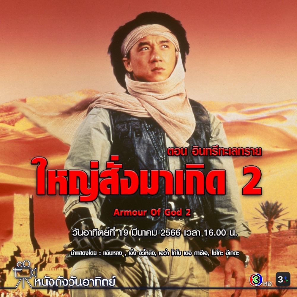 ช่วง “หนังดีวันอาทิตย์” พบกับภาพยนตร์ “ใหญ่สั่งมาเกิด2 ตอน อินทรีทะเลทราย (Armour Of God II)” นักแสดง: เฉินหลง, เจิ้งอวี้หลิง เรื่องราวเกิดขึ้นเมื่อแจ็คกี้ ได้รับการขอร้องจากท่านบารอนให้ไปตามหาทองคำแท่งที่พวกนาซีเยอรมันซ่อนไว้ในทะเลทรายซาฮาร่าเมื่อสมัยสงครามโลกครั้งที่ 2 เคาท์บารอนแห่งเทอริ่งเคยส่งคนออกไปค้นหาทองคำแต่ไม่เคยมีใครรอดกลับมาได้แม้แต่คนเดียว ทางสหประชาชาติก็ต้องการค้นหาทองคำเพื่อนำมาใช้ในโครงการช่วยเหลือประชาชน ดังนั้นท่านบารอนจึงขอให้แจ็คกี้เดินทางไปที่นั่นเพื่อตามหาทองคำให้พบและนำมันกลับมาโดยได้ส่งเอด้า สาวสวยชาวจีนผู้รอบรู้ให้ไปช่วยทำภารกิจนี้ให้สำเร็จ ติดตาม “ใหญ่สั่งมาเกิด2 ตอน อินทรีทะเลทราย (Armour Of God II)” ได้ในวันอาทิตย์ที่ 19 มีนาคม 2566 เวลา 16.00 น.