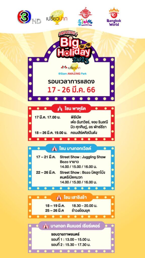 เปิดฉากด้วยไฮไลท์พิเศษสุดกับงาน Amazing Big Holiday X เปรี้ยวปาก @ Siam Amazing Park 17–26 มีนาคมนี้ 11.00-21.00 น. อร่อยฟินกับร้านเด็ดร้านดังกว่า 200 ร้านค้า สนุกกับกิจกรรมมากมายในบรรยากาศงานวัดกรุงเทพฯ ย้อนยุค ทั้งซุ้มเกมงานวัด รำวง สตรีทโชว์ สอยดาว ดูหนัง พบกับ 2 พิธีกรคู่ซี้ เต๋อ ฉันวิทชช์-จอย รินลณี และคอนเสิร์ตศิลปินดัง นำทีมโดย มิว ศุภศิษฏ์ อินดิโก้ ไรอัล กาจบัณฑิต เต๋า ทัศนัย บอนซ์ ณดล เจ้าของเพลงฮิตฉลามชอบงับคุณ และน่ารักชิปปุ๋ง งานนี้เที่ยวฟรี