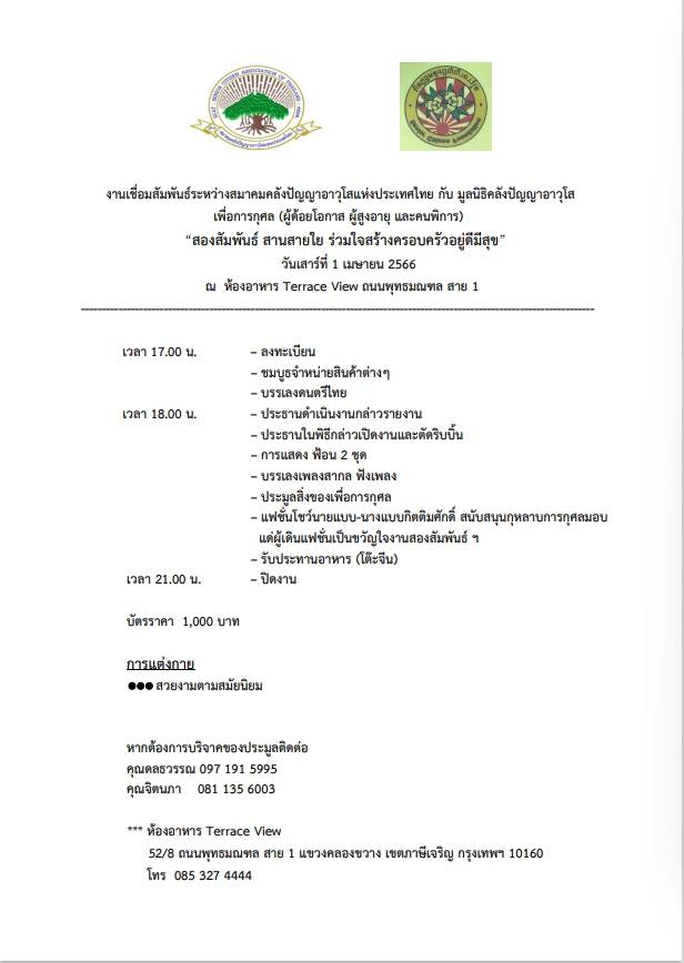 เชื่อมสัมพันธ์ ระหว่างสมาคมคลังปัญญาอาวุโส เพื่อการกุศล (ผู้ด้อยโอกาส ผู้สูงอายุ และคนพิการ) ในโครงการ “สองสัมพันธ์ สานสายใย ร่วมใจสร้างครอบครัวอยู่ดีมีสุข” โดย พล.ต.เจนวิทย์ ยามะรัตน์ กรรมการบริหารสมาคมคลังปัญญาอาวุโสแห่งประเทศไทย ประธานจัดงานเชื่อมสัมพันธ์ เพื่อการกุศลช่วยเหลือ(ผู้ด้อยโอกาศ ผู้สูงอายุ และคนพิการ)