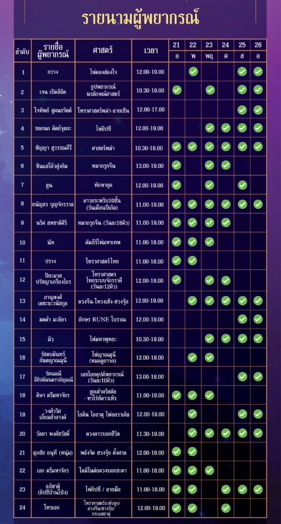 บรรยากาศภายในงานมี 24 นักพยากรณ์และนักโหราศาสตร์ชื่อดังจากทีมสิริวัฒนาพยากรณ์ อาทิ อ.ปิยะมาศ ปรัชญาเกรียงไกร (โหราศาสตร์ไทยระบบจักรราศี), อ.ศุภชัย อนุที (พลังจิต ฮวงจุ้ย ตั้งศาล), อ.กวาง – ศิริลักษณ์ ชาลี (ไพ่ตอง), อ.นริศ สหชาติศิริ (หมากรุกจีน), อ.ใจทิพย์ สุคนธจิตต์ (โหราศาสตร์พม่า-ลายเซ็น), อ.ชัญญา สุวรรณคีรี (ศาสตร์พม่า), อ.ธนัญธร บุญจักรวาล (ดวงไทยดาวกระพริบ 10 ชั้น), อ.อภิชาติ (ไพ่ยิปซี, ลายมือ) และ อ.เอก ตรีมหาจักร (โดมิโนต่อดวงบอกชะตา), อ.ชลกนก ดิตถ์จุลกะ (ไพ่ยิปซี) และอีกมากมายหลายท่าน ทั้งศาสตร์ทักษายุค คัมภีร์ไพ่มหาเทพ ดวงจีน โหวงเฮ้ง หมอดูยาจก ลูกเต๋าคริสตัล จนถึงโหราศาสตร์ระดับสูงกระแสธาตุ