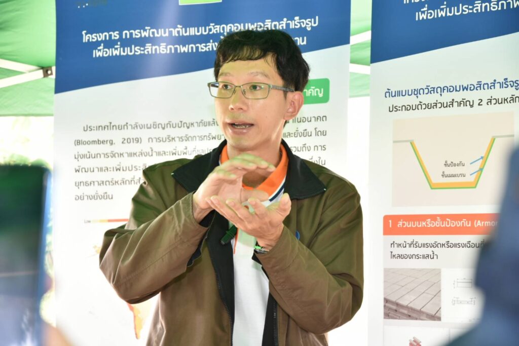 ด้านนายเจต พาณิชภักดี แห่ง (วว.) หัวหน้าโครงการวิจัย เรื่อง “การพัฒนาต้นแบบวัสดุคอมพอสิตสำเร็จรูป เพื่อเพิ่มประสิทธิภาพการส่งน้ำคลองชลประทาน” กล่าวว่า สถาบันวิจัยวิทยาศาสตร์และเทคโนโลยีแห่งประเทศไทย (วว.) ได้รับการสนับสนุนจาก วช. ในการดำเนินการพัฒนาต้นแบบวัสดุคอมพอสิตสำเร็จรูป เพื่อเพิ่มประสิทธิภาพการส่งน้ำคลองชลประทาน ที่ผ่านมา น้ำชลประทานถูกลำเลียงไปตามคลองส่งน้ำและไหลลงสู่คลองระบายน้ำที่เป็นคลองดิน พบปัญหาการสูญเสียน้ำในระบบส่งน้ำเนื่องจากการซึมของน้ำชลประทานผ่านวัสดุก่อสร้างคลองที่เป็นดิน คลองส่งน้ำที่ใช้งานเป็นระยะเวลานานจึงนิยมที่จะปรับปรุงด้วยการดาดคลองส่งน้ำด้วยคอนกรีต ซึ่งมีคุณสมบัติในการป้องกันการรั่วซึมของน้ำได้ แต่ปัญหาสำคัญที่มักจะเกิดขึ้นกับคลองส่งน้ำดาดด้วยคอนกรีต คือ การเกิดโพรงใต้แผ่นคอนกรีตจากการกัดเซาะของน้ำเป็นรูโพรง และปัญหาการรั่วซึมของน้ำผ่านคลองที่มีปริมาณมากกว่าการออกแบบ รวมทั้งการเจริญเติบโตของวัชพืชน้ำ ซึ่งเกิดจากดินบริเวณใต้ผนังดาดคอนกรีตเกิดการทรุดตัวจากการเลื่อนไหล ทำให้ผนังดาดคอนกรีตเกิดการแตกร้าว และเมื่อเกิดการกัดเซาะของวัสดุใต้แผ่นคอนกรีตแล้วจะพังทลายได้ในท้ายที่สุด ส่งผลให้เกิดการสูญเสียน้ำถึงร้อยละ 70 และไม่สามารถส่งน้ำไปถึงพื้นที่เพาะปลูกได้ตามเป้าหมาย โดยในต่างประเทศได้มีการเพิ่มประสิทธิภาพการส่งน้ำ และลดการสูญเสียน้ำโดยการใช้แผ่นเมมเบรนจากวัสดุพอลิเมอร์สังเคราะห์ ในการส่งน้ำ ซึ่งพบว่ามีข้อดี คือ ติดตั้งง่าย ใช้เวลาน้อย และมีการสูญเสียน้ำในระหว่างการส่งน้ำที่น้อย ที่ผ่านมา (วว.) มีการพัฒนาชุดวัสดุป้องกันการกัดเซาะจากวัสดุทางธรรมชาติ สำหรับใช้งานปูทับหน้าตลิ่งเพื่อป้องกันการกัดเซาะของน้ำ ประกอบด้วย ชั้นป้องกัน ทำหน้าที่รับแรงอัดหรือแรงเฉือนที่เกิดจากการไหลของกระแสน้ำ และป้องกันเศษหินหรือกรวดที่พัดมากับกระแสน้ำที่จะทำให้ชั้นเมมเบรนเกิดความเสียหายได้ โดยวัสดุชั้นป้องกันมีผิวเรียบ มีความต้านทานแรงอัดมากกว่า 150 กิโลกรัมต่อตารางเซนติเมตร และถูกออกแบบให้สามารถร้อยสลิงได้ ซึ่งจะถูกนำมาวางทับบนชั้นเมมเบรนทำหน้าที่กักเก็บผิวดินไม่ให้ถูกชะออกจากบริเวณแนวตลิ่งและป้องกันการซึมผ่านของน้ำ นอกจากนั้น โครงสร้างชุดวัสดุคอมพอสิต เพื่อเพิ่มประสิทธิภาพการส่งน้ำ เป็นโครงสร้างสำเร็จรูปที่พร้อมติดตั้งได้ทันที และยังสามารถปรับสภาพหรือปรับระดับตามพื้นผิวได้เล็กน้อย เมื่อมีการทรุดของดินบริเวณที่ถูกปูท