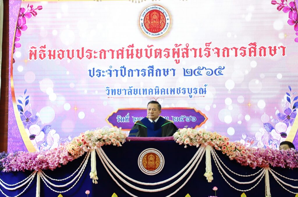 ด้านนายทองจันทร์ ประทุมโฉม ผู้อำนวยการวิทยาลัยเทคนิคเพชรบูรณ์ กล่าวว่า วิทยาลัยเทคนิคเพชรบูรณ์บริหารงานภายใต้นโยบายของสำนักงานคณะกรรมการการอาชีวศึกษา กระทรวงศึกษาธิการ ในด้านการจัดการศึกษาด้านวิชาการ ด้านพัฒนากิจการนักเรียน นักศึกษา และการให้บริการแก่สังคม พร้อมมุ่งสร้างนักเรียน นักศึกษา เตรียมพร้อมเข้าสู่ตลาดแรงงาน และสังคม ส่งเสริมให้เป็นบุคคลแห่งการเรียนรู้มีทักษะในการใช้ชีวิต และการทำงานในศตวรรษที่ 21 เห็นคุณค่าทางสังคม วัฒนธรรม มีความรู้ ความสามารถ ตรงความต้องการของตลาดแรงงาน ปัจจุบันวิทยาลัยเทคนิคเพชรบูรณ์มีจัดการเรียนการสอน 3 ระดับ ประกอบด้วย ระดับปริญญาตรีเทคโนโลยีบัณฑิต ระดับประกาศนียบัตรวิชาชีพชั้นสูง และระดับประกาศนียบัตรวิชาชีพ โดยในปีการศึกษา 2565 มีผู้สำเร็จการศึกษาในทุกระดับรวม 1,012 คน แยกเป็นระดับปริญญาตรีเทคโนโลยีบัณฑิต 49 คน ระดับประกาศนียบัตรวิชาชีพชั้นสูง 556 คน และระดับประกาศนียบัตรวิชาชีพ 407 คน ซึ่งการจัดพิธีมอบประกาศนียบัตรผู้สำเร็จการศึกษาในครั้งนี้ก็เพื่อ ยกย่องเชิดชูเกียรติ นักเรียนนักศึกษา และเพื่อให้นักเรียน นักศึกษา เกิดความภาคภูมิใจในความสำเร็จของตนเอง