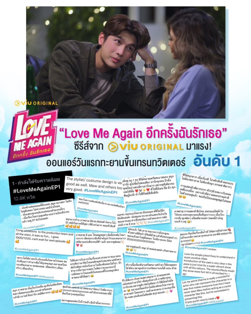 ค่ำคืนที่ผ่านมา (23 มีนาคม) ถือเป็นการรวมพลคนรักออริจินัลซีรีส์ “Love Me Again อีกครั้งฉันรักเธอ EP1” ก็คงไม่ผิดนัก เพราะเหล่าบรรดา FC แฟนด้อม และคนที่ชื่นชอบซีรีส์แนวตลก-โรแมนติก ต่างเทใจติดแฮชแท็กให้กับซีรีส์เรื่องนี้อย่างท่วมท้น จนทะยานขึ้นอันดับ 1 เทรนด์ทวิตเตอร์ที่ฮิตที่สุดของประเทศไทย