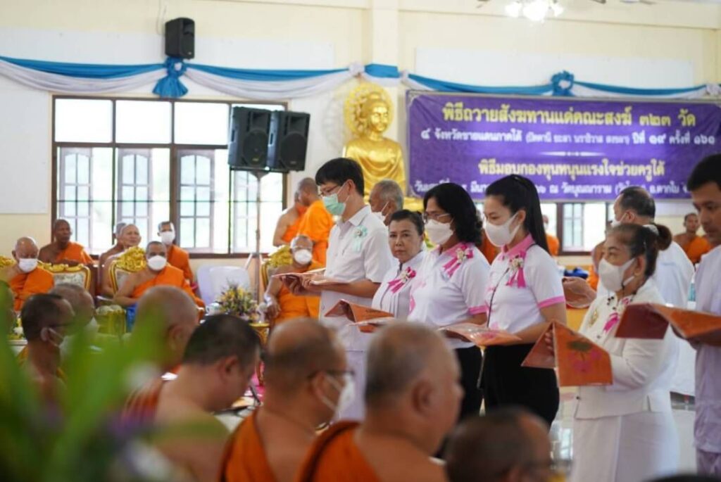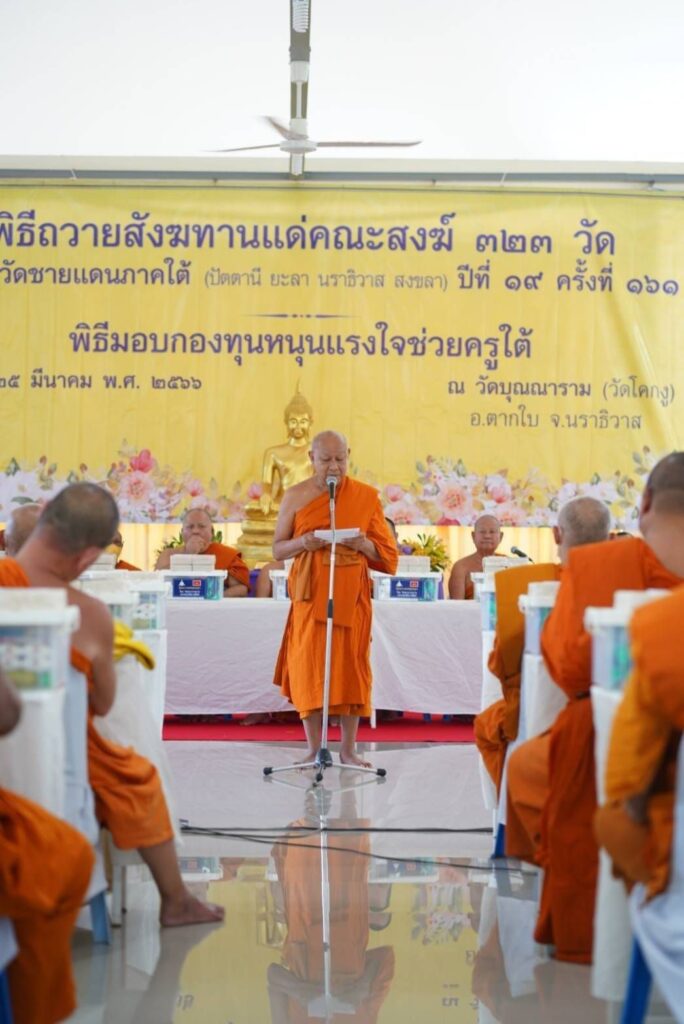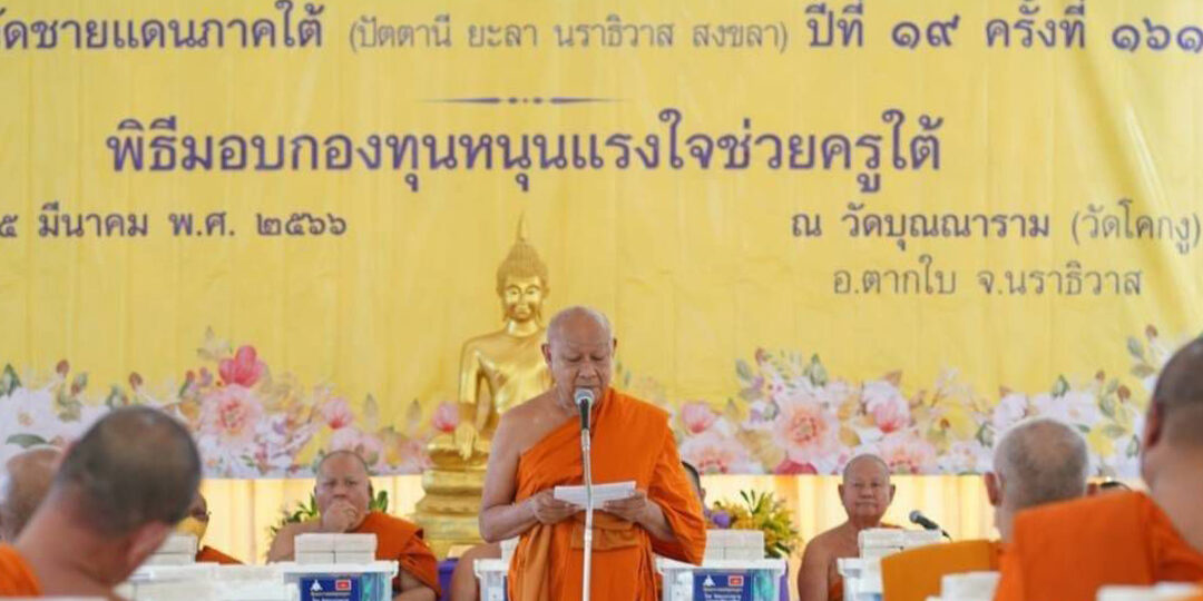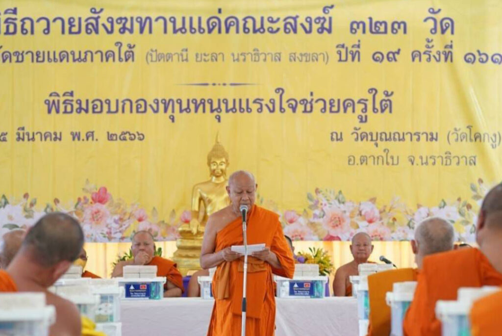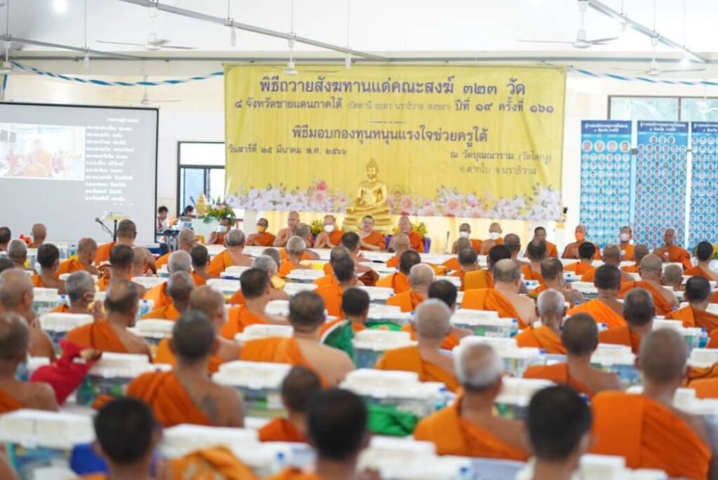 วันที่ 25 มีนาคม พ.ศ.2566 วัดพระธรรมกาย จังหวัดปทุมธานี มูลนิธิธรรมกาย และกัลยาณมิตรทั่วทั้งโลก ร่วมกับ คณะสงฆ์จังหวัดนราธิวาสหน่วยงานภาครัฐ ภาคเอกชน และประชาชนจังหวัดนราธิวาส จัดพิธีถวายสังฆทานแด่คณะสงฆ์ 323 วัด พิธีทำบุญอุทิศส่วนกุศลแด่ผู้วายชนม์จากเหตุการณ์ความไม่สงบ 4 จังหวัดชายแดนภาคใต้ (ปัตตานี ยะลา นราธิวาส และ 4 อำเภอในจังหวัดสงขลา) ปีที่ 19 ครั้งที่ 161 และพิธีมอบกองทุนหนุนแรงใจช่วยครูใต้ ปีที่ 16 ครั้งที่ 126 จำนวน 159 กองทุน ณ วัดบุณณาราม (วัดโคกงู) อำเภอตากใบ จ.นราธิวาส พร้อมถ่ายทอดออนไลน์ ผ่านแอปพลิเคชัน ZOOM, FACEBOOK LIVE และ YouTube มีพุทธศาสนิกชนทั้งในและต่างประเทศร่วมกิจกรรมเป็นจำนวนมาก