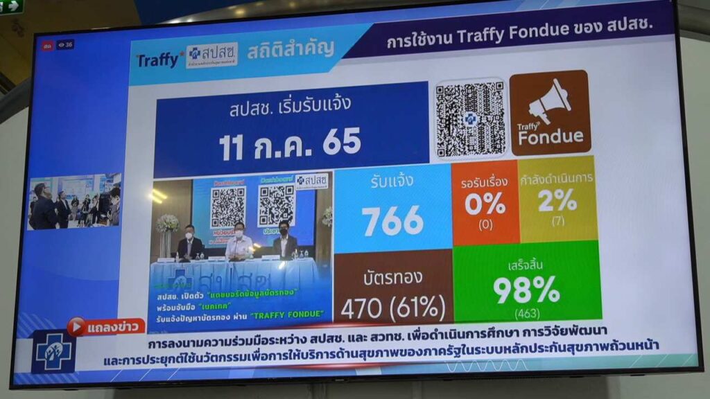 ที่ผ่านมา (สวทช.) ได้นำผลงานงานวิจัยและพัฒนามาสนับสนุน ได้แก่ แอปพลิเคชัน ทราฟฟี่ฟองดูว์ (Traffy Fondue) : Dashboard สปสช. เพิ่มช่องทางรับข้อเสนอแนะสิทธิบัตรทอง ในการรับแจ้งเรื่องร้องเรียนและปัญหาการใช้สิทธิบัตรทอง 30 บาท ระหว่าง (สปสช.) กับประชาชนให้สะดวกรวดเร็วยิ่งขึ้น ซึ่งปัจจุบันมีจำนวนเรื่องที่ร้องเรียน 766 เรื่อง แบ่งเป็นเรื่องที่เกี่ยวกับสิทธิบัตรทอง 470 เรื่อง (61.36%) ซึ่งดำเนินการแก้ไขเสร็จสิ้นแล้ว 463 เรื่อง และอยู่ระหว่างดำเนินการ 7 เรื่อง ไม่เกี่ยวข้องและส่งต่อให้หน่วยงานที่เกี่ยวข้อง 296 เรื่อง (38.64%) เช่น แจ้งเรื่องฝุ่น จราจร และคนทิ้งขยะ เป็นต้น และในปัจจุบัน (สปสช.) กำลัง เปิดให้ ไลน์ทราฟฟี่ ฟองดูว์ เป็นอีกหนึ่งช่องทางใหม่ที่เพิ่มความสะดวกให้ประชาชนในการให้ความคิดเห็นต่อ “กองทุนบัตรทอง” ปี 2566 อีกด้วย