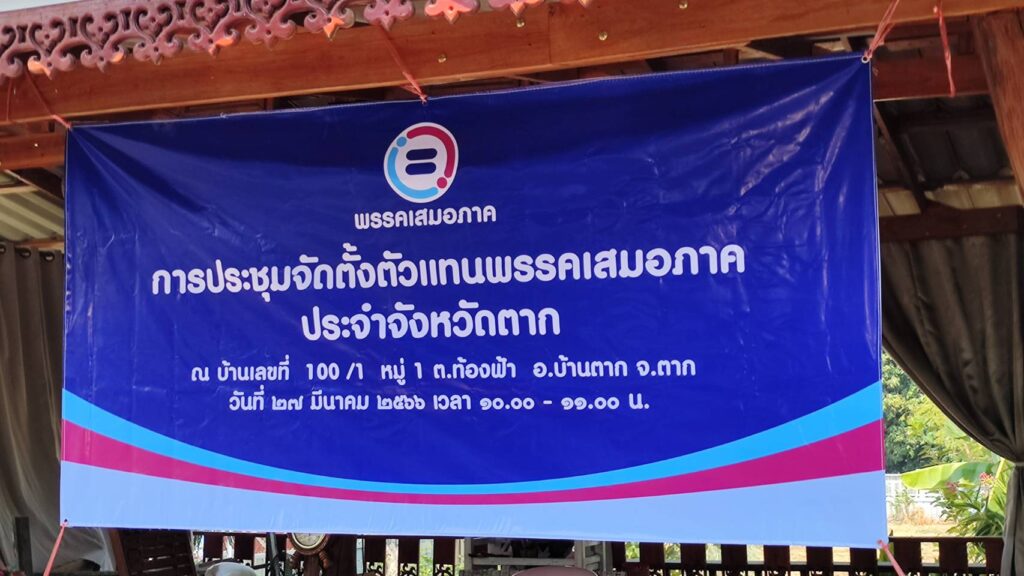 วันที่ 27 มีนาคม 2566 เวลา 11:00น.-11:30น. พรรคเสมอภาค โดยมีท่าน ดร. รฎาวัญ วงศ์ศรีวงศ์ เป็นหัวหน้าพรรค ได้มีการจัดประชุมจัดตั้งตัวแทนประจำจังหวัดตาก ณ.บ้านเลขที่ 100/1 หมู่ 1 ตำบล.ท้องฟ้า อำเภอ.บ้านตาก จังหวัดตาก 63120