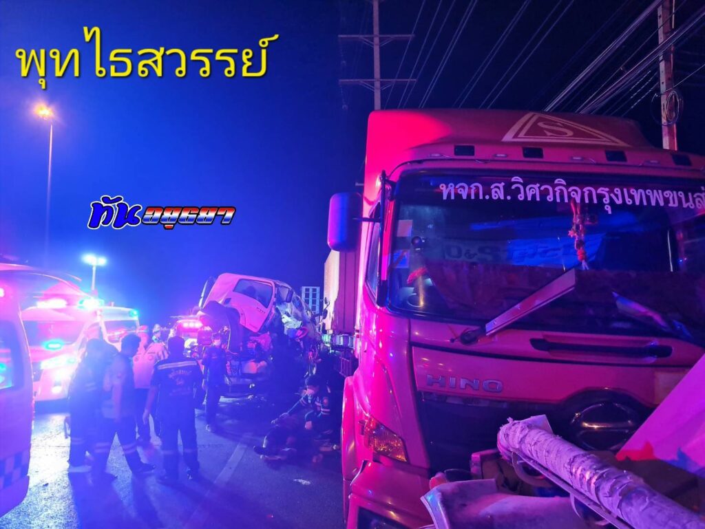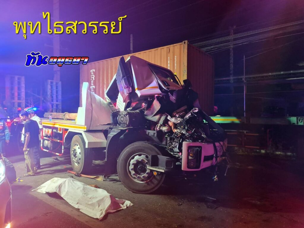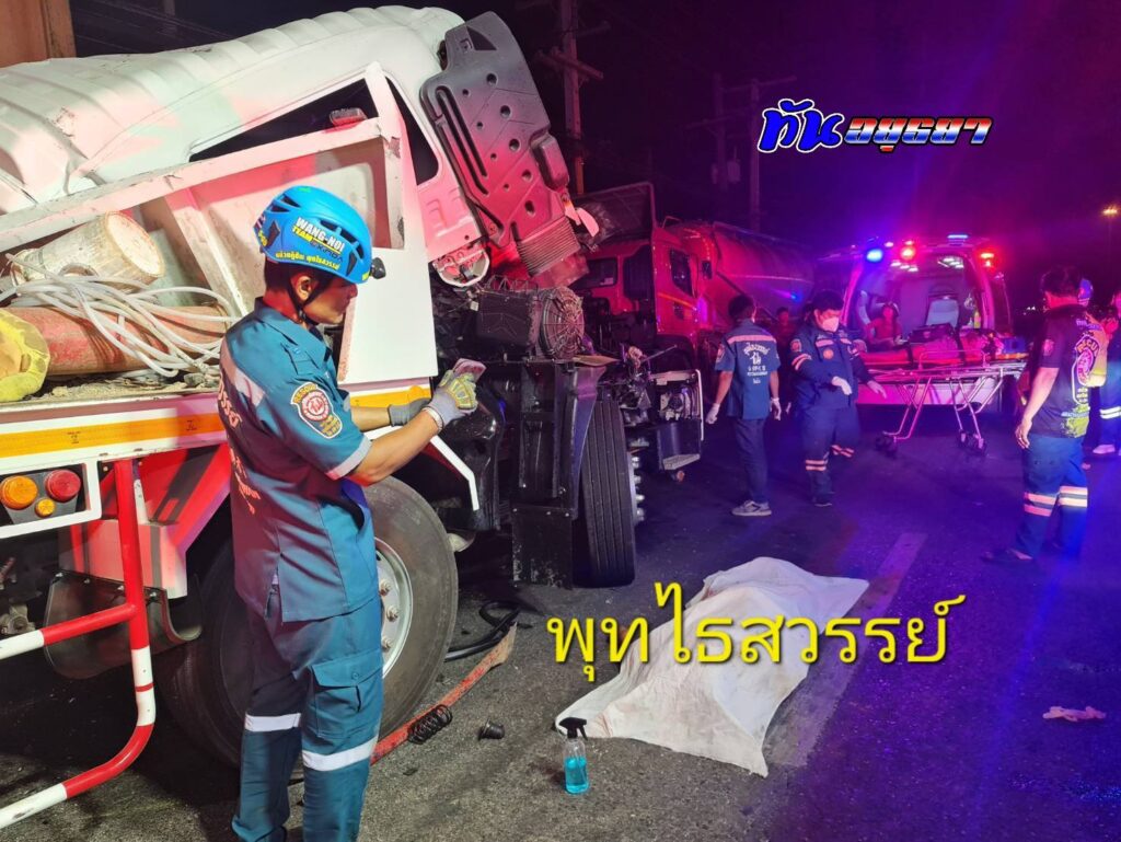 ในที่เกิดเหตุ พบรถพ่วง ทะเบียน 90-4287 นครราชสีมา พุ่งอัดชนท้ายรถพ่วง ทะเบียน 77-8773 กรุงเทพฯ โดยในเกิดเหตุ พบผู้เสียชีวิต รวม 3 ราย แยกเป็นพบผู้เสียชีวิต 2 ราย ในซากหน้ารถที่พุ่งชน คือ 1.นายทินกร กรรเชียง อายุ 35 ปี 47 ม.4 ต.นาเริก อ.พนันนิคม จ.ชลบุรี และ 2.น.ส.กาญจนา ปานแม้น อายุ 48 ปี 121 ม.4 ต.กุดจอก อ.หนองมะโม จ.ชัยนาท และนอกรถยังพบผู้เสียชีวิตเป็นชายอีก 1 ราย กระเด็นออกมาเสียชีวิตริมถนน
