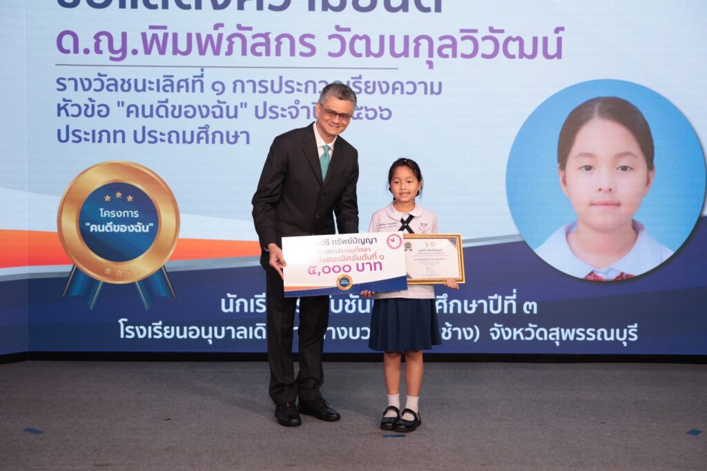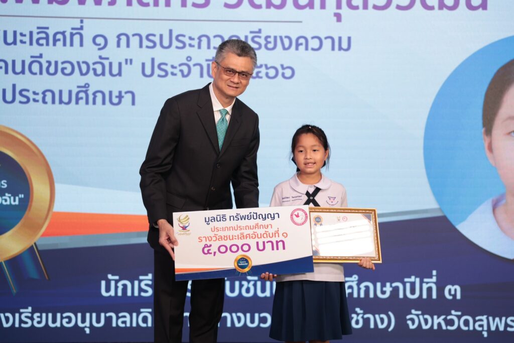 รางวัลชนะเลิศที่ ๑ เด็กหญิงพิมพ์ภัสกร วัฒนกุลวิวัฒน์ นักเรียนระดับชั้นประถมศึกษาปีที่ ๓ โรงเรียนอนุบาลเดิมบางนางบวช (วัดท่าช้าง) จังหวัดสุพรรณบุรี
