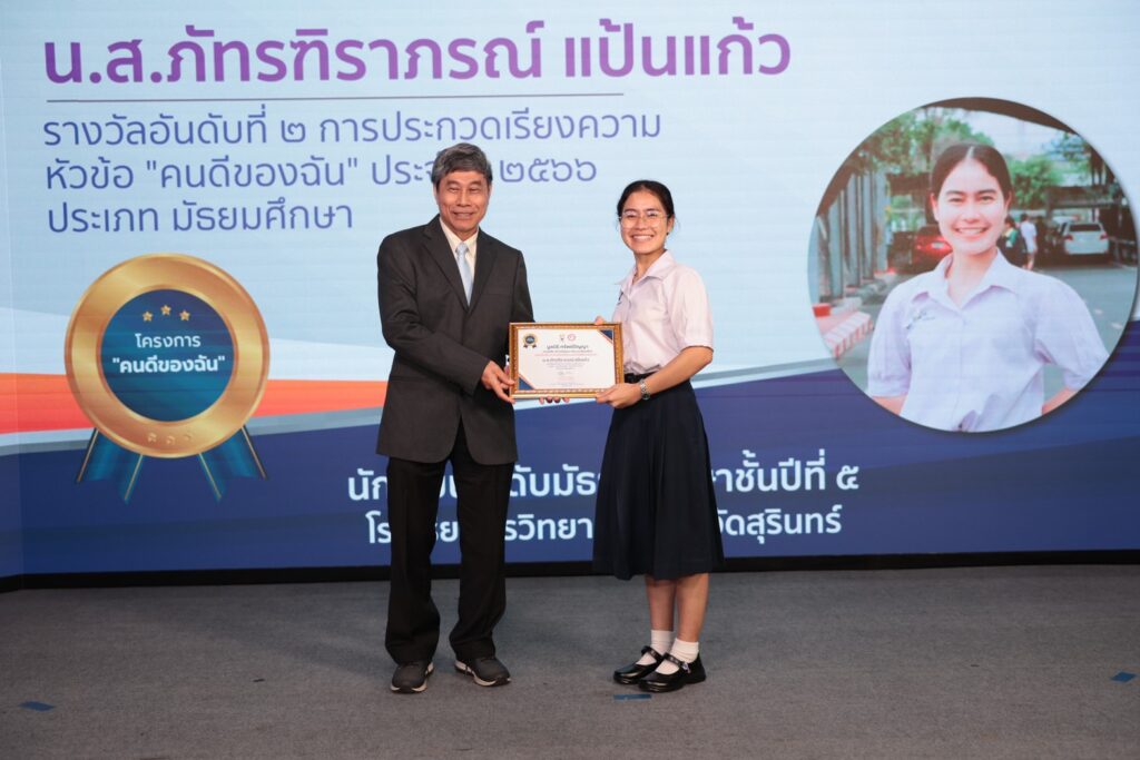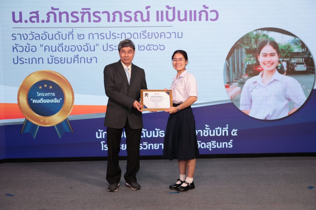 รางวัลอันดับที่ ๒ นางสาวภัทรฑิราภรณ์ แป้นแก้ว นักเรียนระดับมัธยมศึกษาชั้นปีที่ ๕ โรงเรียนสุรวิทยาคาร