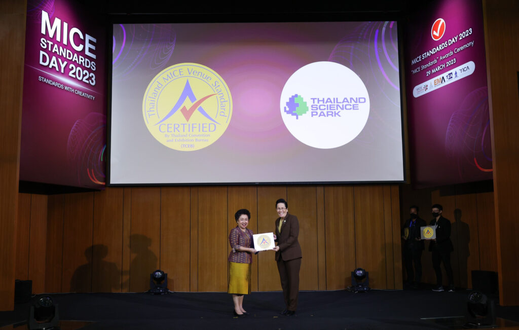 เมื่อวันที่ 29 มีนาคม 2566 ณ อาคารอาเซียน รัชดา กรุงเทพฯ : ดร.จุฬารัตน์ ตันประเสริฐ รองผู้อำนวยการ สำนักงานพัฒนาวิทยาศาสตร์และเทคโนโลยีแห่งชาติ (สวทช.) เข้ารับมอบตราสัญลักษณ์การรับรองมาตรฐานสถานที่จัดงานประเทศไทย (Thailand MICE Venue Standard : TMVS) จาก ดร.อรรชกา สีบุญเรือง ประธานกรรมการสำนักงานส่งเสริมการจัดประชุมและนิทรรศการ (องค์การมหาชน) หรือ ทีเส็บ (TCEB) ในงาน MICE Standard Day 2023 เพื่อส่งเสริมมาตรฐานสถานที่จัดงานของไทยและอาเซียน และเพิ่มความสามารถในการแข่งขัน รองรับตลาดธุรกิจไมซ์ในอนาคต