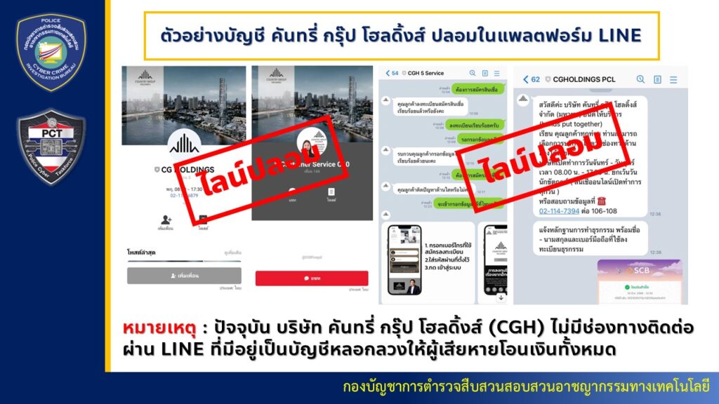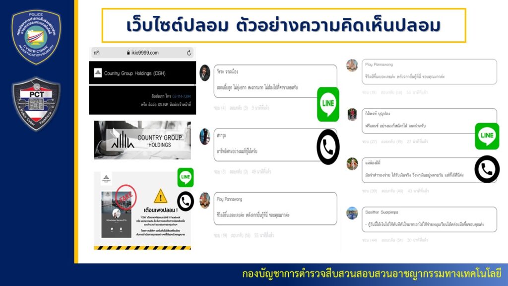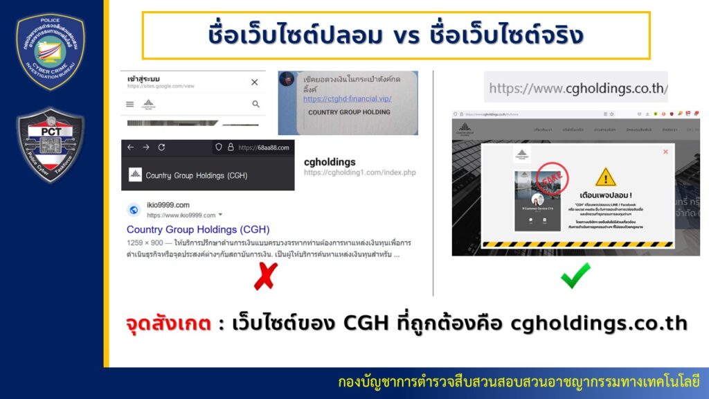 ได้รับรายงานจากกองบังคับการตรวจสอบและวิเคราะห์อาชญากรรมทางเทคโนโลยี (บก.ตอท.) ว่าที่ผ่านมามีผู้เสียหายหลายรายถูกมิจฉาชีพหลอกลวงให้กู้เงินผ่านเว็บไซต์ของ บริษัท คันทรี่ กรุ๊ป โฮลดิ้งส์ จำกัด (Country Group Holdings) ซึ่งถูกปลอมขึ้นมาให้คล้ายกับเว็บไซต์จริง โดยก่อนเกิดเหตุผู้เสียหายได้เข้าเว็บไซต์ค้นหาแหล่งกู้เงินออนไลน์ ทำให้เจอเว็บไซต์ปลอมดังกล่าว มีการแอบอ้างว่าเป็นผู้ให้บริการด้านการเงินแบบครบวงจร สมัครง่าย ให้วงเงินไม่อั้น อนุมัติเร็ว ดอกเบี้ยต่ำ ไม่ตรวจสอบเครดิตบูโร ใช้เอกสารน้อย ปลอดภัย และมีกฎหมาย PDPA คุ้มครอง เป็นต้น