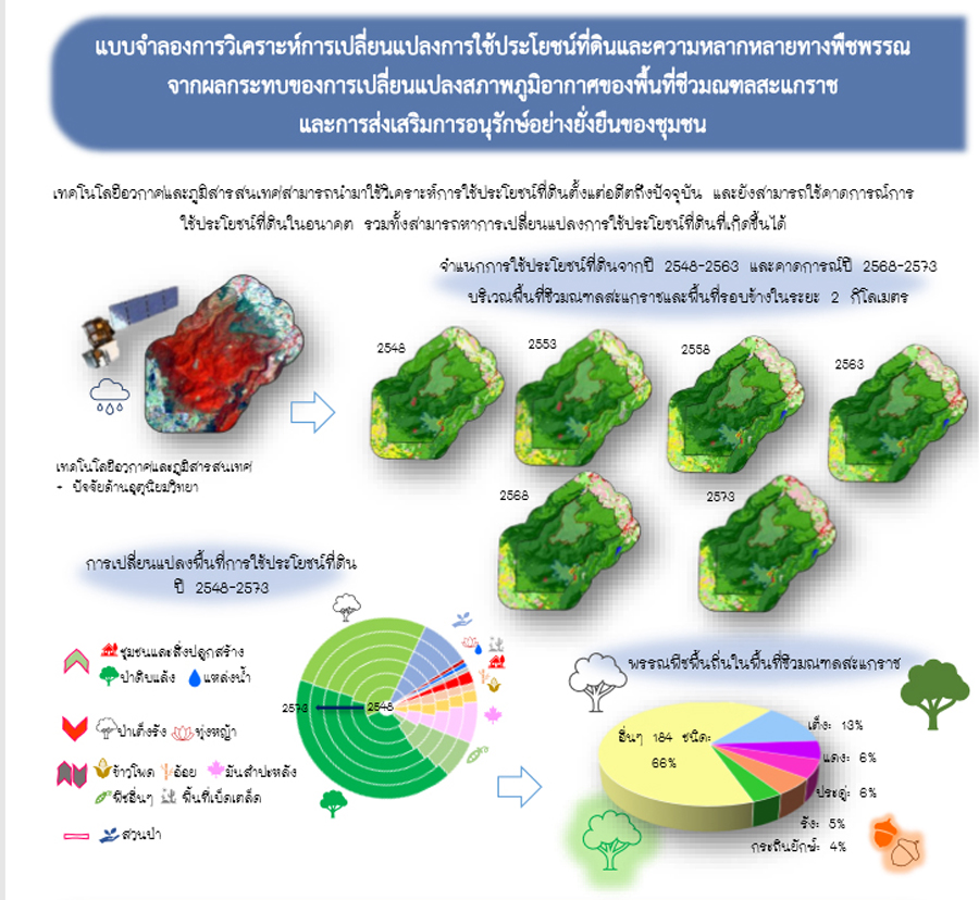 นอกจากนี้ ยังมีการใช้ภาพถ่ายดาวเทียม ในการพัฒนาแบบจำลองเพื่อวิเคราะห์การเปลี่ยนแปลงการใช้ประโยชน์ที่ดินและความหลากหลายทางพืชพรรณจากผลกระทบของการเปลี่ยนแปลงสภาพภูมิอากาศของพื้นที่สงวนชีวมณฑลสะแกราชและการส่งเสริมการอนุรักษ์อย่างยั่งยืนของชุมชน ซึ่งจากผลการวิเคราะห์การเปลี่ยนแปลงการใช้ประโยชน์ที่ดินตั้งแต่ปี2548-2573 พบว่า พื้นที่ป่าเต็งรังและทุ่งหญ้าภายในสถานีชีวมณฑลสะแกราชมีพื้นที่ลดลง ในขณะที่พื้นที่เกษตรกรรม ได้แก่ ข้าวโพด อ้อย มันสำปะหลัง และพืชอื่นๆ มีพื้นที่เพิ่มขึ้น