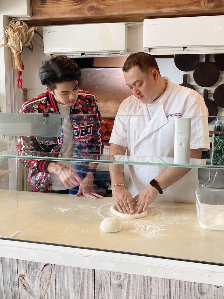“คัทเคยมีโอกาสให้เห็นการทำอาหารอิตาเลียนมาบ้างในยูทูป ในทีวี วันนี้ได้มีโอกาสมาเรียนกับเชฟต้นตำรับจากอิตาลีเลย รู้สึกตื่นเต้น และดีใจมาก เพราะปกติคัทชอบทานพิซซ่าอยู่แล้ว พอได้มีมาทำเองรู้สึกไม่ง่ายเลย ตั้งแต่การนวดแป้ง ตรงขอบต้องหนากว่าตรงกลาง แต่ถ้าแป้งบางเกินไปก็จะขาด สัดส่วนน้ำหนัดมือก็สำคัญ สูตรและวัตถุดิบของที่ร้านนี้ เค้าจะส่งตรงมาจากประเทศอิตาลี จึงมีรสชาตที่มีความเฉพาะตัว ไฟที่ใช้ก็เป็นเตาฟืนแบบโบราณ”