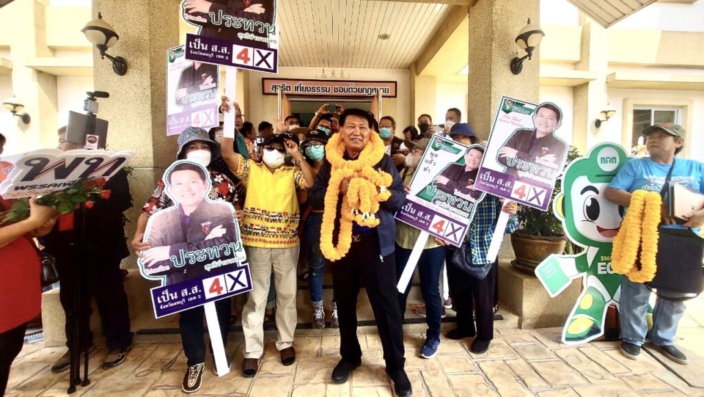 ใช้สองมือเราชี้ดวงชะตาให้กับพวกเขาว่าจะเป็นตัวแทนเราเข้าสู่สภา เข้าคูหา พรรคที่ชอบบุคคลที่เรารัก ใช้สองมือเราชี้ดวงชะตาเขาไปใช้สิทธิ์เลือกตั้งกันนะครับคนลพบุรีรักประชาธิปไตย เชื่อคนลพบุรีจะเลือกคนดีเข้าสู่สภา