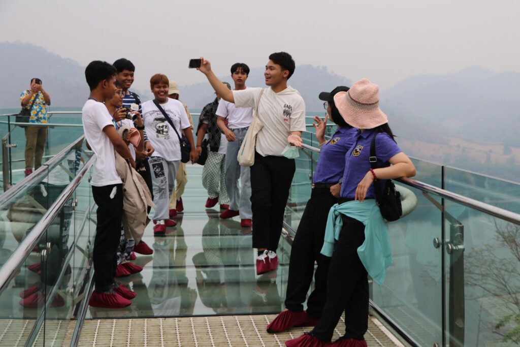 เดินทางไปเยี่ยมชมสกายวอร์คเชียงคาน ฟังการบรรยายสรุปจากกองกำลังสุรศักดิ์มนตรีในการปฏิบัติงานในพื้นที่รับผิดชอบชายแดนไทย – สปป.ลาว โดยสกายวอล์ค เชียงคาน หรือ สกายวอล์ค ภูคกงิ้ว ตั้งอยู่ที่ ตำบลปากตม อำเภอเชียงคาน จังหวัดเลย สูงกว่าระดับแม่น้ำโขงกว่า 80 เมตร หรือเทียบเท่ากับตึก 30 ชั้น มีทางเดินที่ทำด้วยกระจกใสยาวกว่า 100 เมตร กว้างกว่า 2 เมตร เป็นจุดที่เสียวและตื่นเต้นที่สุดและยังเป็นสถานที่ที่นักท่องเที่ยวสามารถเดินชมวิวได้อย่างเพลิดเพลินโดยบนสกายวอล์คนั้น จะสามารถมองเห็นแม่น้ำเหือง แม่น้ำที่กั้นชายแดนไทยได้อย่างสวยงดงาม ส่วนด้านบน สกายวอล์คเชียงคานนั้น ก็ยังเป็นที่ประดิษฐาน พระใหญ่ภูคกงิ้วซึ่งเป็นพระพุทธรูปปางลีลาประทานพร หล่อด้วยไฟเบอร์ผสมเรซิ่นทอง สูงกว่า 19 เมตร นับว่าเป็นอีกสัญลักษณ์ของแลนด์มาร์คใหม่นี้อีกด้วย