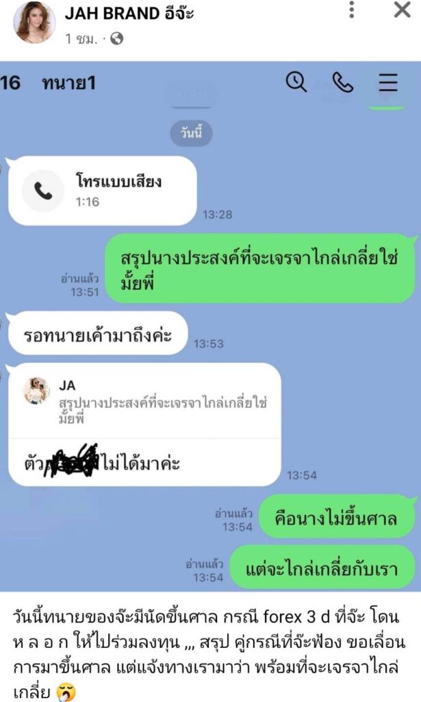 งานนี้ จ๊ะ อาร์สยาม ได้เผยข้อความแชทที่ตนเองคุยกับทนายถึงเรื่องดังกล่าว พร้อมเขียนข้อความกำกับว่า “วันนี้ทนายของจ๊ะมีนัดขึ้นศาล กรณี forex 3 d ที่จ๊ะโดนหลอกให้ไปร่วมลงทุน ,,,สรุปคู่กรณีที่จ๊ะฟ้อง ขอเลื่อนการมาขึ้นศาล แต่แจ้งทางเรามาว่า พร้อมที่จะเจรจาไกล่เกลี่ย