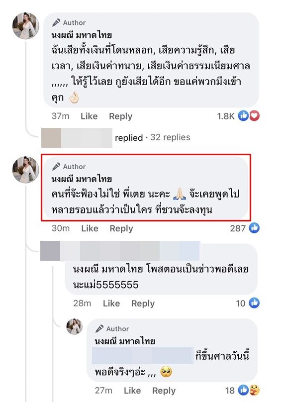 นอกจากนี้ สาวจ๊ะ ยังได้เขียนเพิ่มเติมในคอมเมนต์ไว้อย่างดุเดือดว่า “ฉันเสียทั้งเงินที่โดนหลอก, เสียความรู้สึก, เสียเวลา, เสียเงินค่าทนาย, เสียเงินค่าธรรมเนียมศาล ,,,,,, ให้รู้ไว้เลย กูยังเสียได้อีก ขอแค่พวกมึXเข้าคุก”
