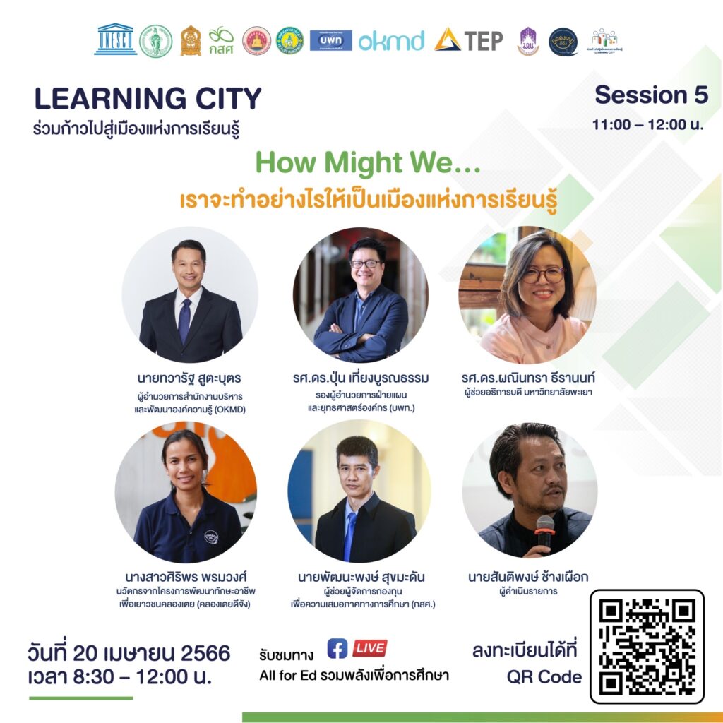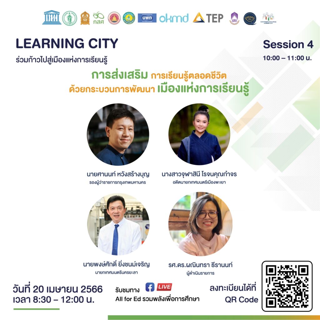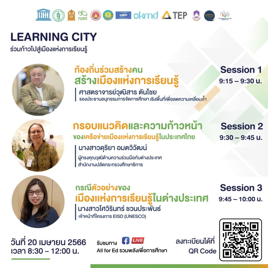 กองทุนเพื่อความเสมอภาคทางการศึกษา (กสศ.) ร่วมกับกระทรวงศึกษาธิการ องค์การการศึกษาวิทยาศาสตร์และวัฒนธรรมแห่งสหประชาชาติ (องค์การยูเนสโกกรุงเทพฯ) กรุงเทพมหานคร ภาคีเพื่อการศึกษาไทย (TEP : Thailand Education Partnership) และภาคีเครือข่ายที่เกี่ยวข้องกับการสร้างความเสมอภาคทางการศึกษาในระดับพื้นที่ จะจัดเวที “Learning City ร่วมก้าวไปสู่เมืองเเห่งการเรียนรู้” เวทีระดมความร่วมมือขับเคลื่อนสู่เมืองเเห่งการเรียนรู้ เพื่อลดความเหลื่อมล้ำทางการศึกษา โดยกิจกรรมจะจัดขึ้นในรูปแบบออนไลน์ ผ่านระบบ ZOOM ในวันที่ 20 เมษายน 2566 เวลา 09.00-12.00 น. เพื่อเป็นพื้นที่ในการจุดประกายแนวคิด และนำเสนอองค์ความรู้ นวัตกรรม ตลอดจนเครื่องมือที่เกี่ยวข้องกับการปฏิรูปการศึกษา และการจัดการศึกษาเชิงพื้นที่ตามกรอบแนวคิดเมืองแห่งการเรียนรู้ สร้างการมีส่วนร่วมและสร้างความตระหนักของผู้ส่วนเกี่ยวข้องในการร่วมสร้างความเสมอภาคทางการศึกษาระดับพื้นที่ และเสนอแนวทางในการร่วมสร้างความเสมอภาคทางการศึกษาในระดับพื้นที่