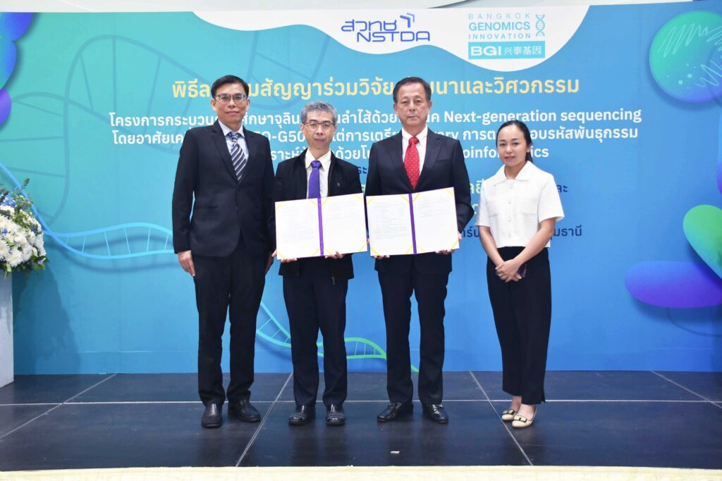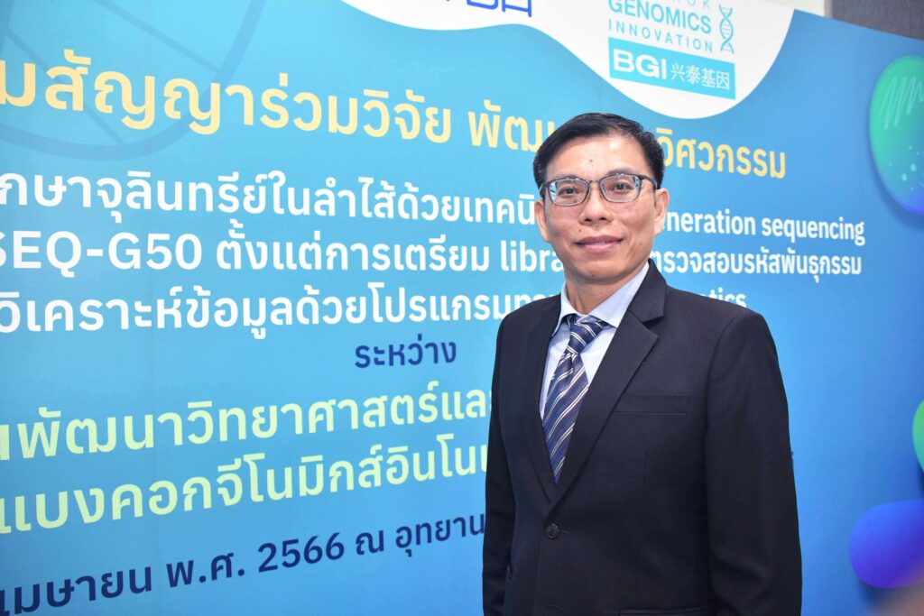 เมื่อวันที่ 10 เมษายน 2566 ณ อุทยานวิทยาศาสตร์ประเทศไทย จ.ปทุมธานี : ดร.ศรัณย์ สัมฤทธิ์เดชขจร รองผู้อำนวยการสำนักงานพัฒนาวิทยาศาสตร์และเทคโนโลยีแห่งชาติ (สวทช.) และนายปรีชา เลาหพงศ์ชนะ กรรมการ บริษัท แบงคอกจีโนมิกส์อินโนเวชั่น จำกัด (มหาชน) หรือ บีเคเคจีไอ (BkkGI) ร่วมลงนามบันทึกข้อตกลงความร่วมมือด้านการวิจัยและพัฒนา “โครงการกระบวนการศึกษาจุลินทรีย์ในลำไส้ด้วยเทคนิค Next-generation sequencing โดยอาศัยเครื่อง DNBSEQ-G50 (DNBSEQ-G50) ตั้งแต่การเตรียม library, การตรวจสอบรหัสพันธุกรรม และการวิเคราะห์ข้อมูลด้วยโปรแกรมทาง Bioinformatics” ระหว่างสำนักงานพัฒนาวิทยาศาสตร์และเทคโนโลยีแห่งชาติ (สวทช.) และบริษัทแบงคอกจีโนมิกส์อินโนเวชั่น จำกัด (มหาชน) หรือ บีเคเคจีไอ (BkkGI) โดยมี ดร.ศิษเฎศ ทองสิมา ผู้อำนวยการธนาคารทรัพยากรชีวภาพแห่งชาติ (สวทช.) และดร.เสาวลักษณ์ ด่านสกุล กรรมการบริษัทฯ เป็นสักขีพยาน