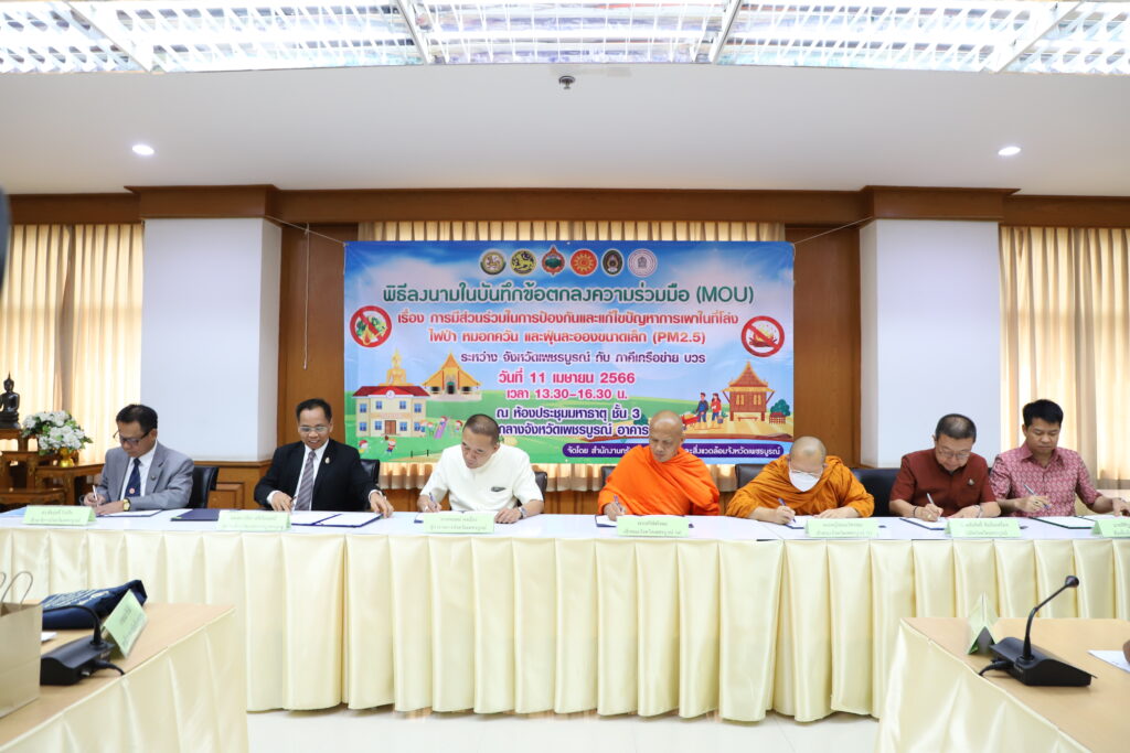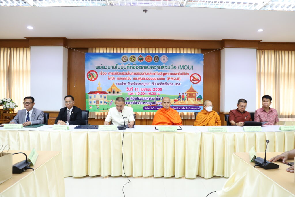 สำหรับการลงนามบันทึกข้อตกลง ความร่วมมือ (MOU) เรื่อง การมีส่วนร่วมในการป้องกันและแก้ไขปัญหาการเผาในที่โล่ง ไฟป่า หมอกควัน และฝุ่นละอองขนาดเล็ก (PM2.5) สำนักงานทรัพยากรธรรมชาติและสิ่งแวดล้อมจังหวัดเพชรบูรณ์จัดขึ้น โดยมีจังหวัดเพชรบูรณ์ ร่วมกับภาคีเครือข่าย บวร (บ้าน วัด โรงเรียน/สถาบันการศึกษา) ร่วมลงนาม เพื่อยกระดับปฏิบัติการป้องกันและแก้ไขปัญหาการเผาในที่โล่ง ไฟป่า หมอกควัน และฝุ่นละอองขนาดเล็ก (PM2.5) ให้มีความเข้มข้นมากขึ้น เพื่อให้สถานการณ์ปัญหาและผลกระทบที่เกิดขึ้นกลับเข้าสู่ภาวะปกติโดยเร็ว โดยการมีส่วนร่วมของทุกภาคส่วน ในการป้องกันและแก้ไขปัญหา ให้เกิดประสิทธิภาพและประสิทธิผล รวมถึงในปีต่อๆ ไป ทุกภาคีเครือข่ายจะต้องให้ความสำคัญ ร่วมกันรณรงค์ และปฏิบัติตามภารกิจหน้าที่อย่างเคร่งครัด ในการบริหารจัดการเชื้อเพลิง (ชิงเก็บ ลดเผา) การนำไปใช้ประโยชน์ของวัสดุที่เหลือใช้ทางการเกษตร วัชพืช ใบไม้ กิ่งไม้ ตั้งแต่ช่วงกลางฤดูหนาวจน เข้าสู่ฤดูฝนถัดไปอย่างจริงจังต่อเนื่อง