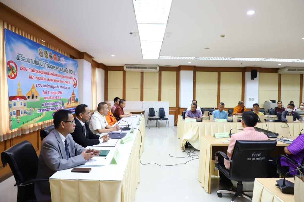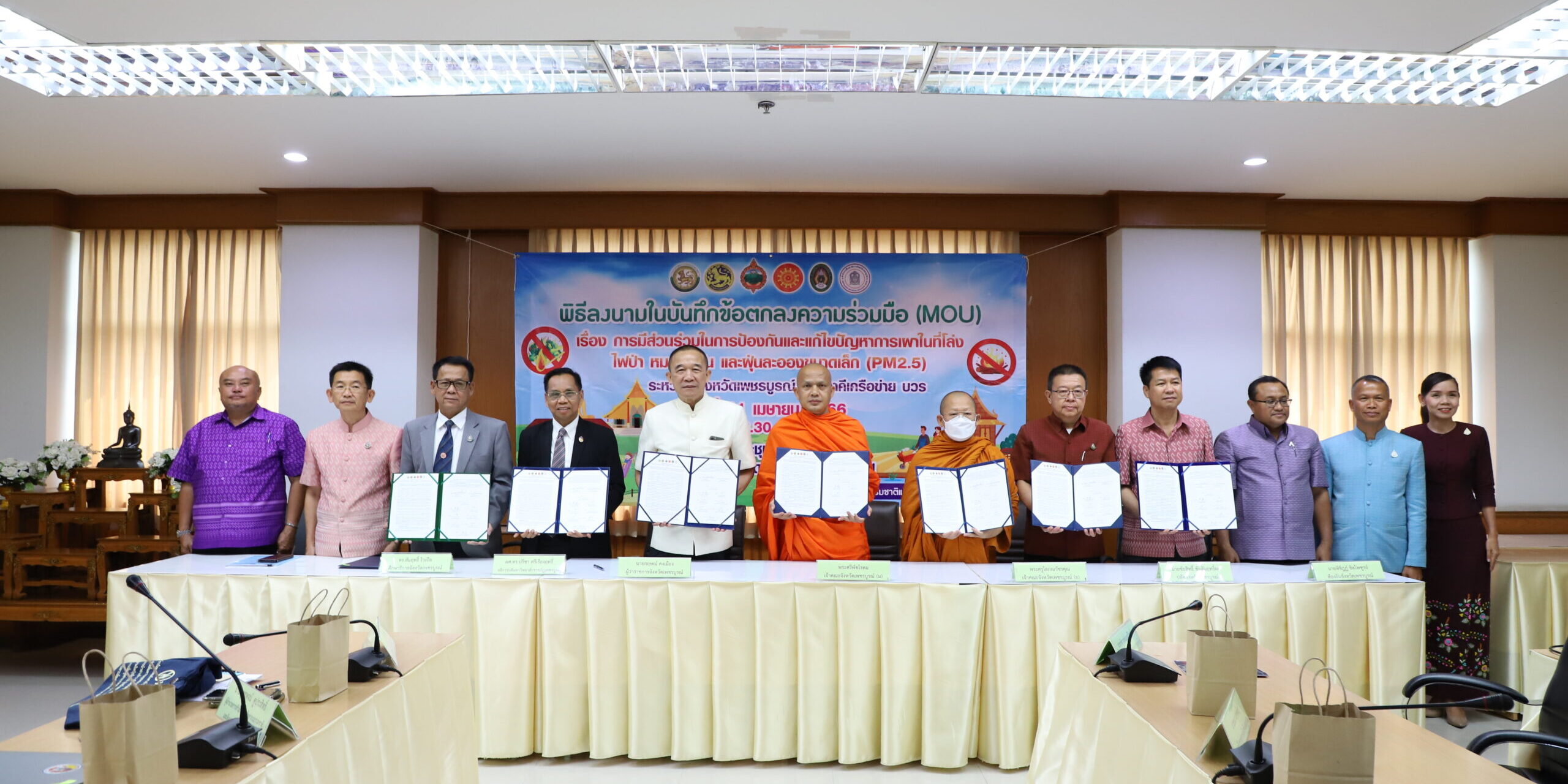 ที่ห้องประชุมมหาธาตุ ชั้น 3 อาคาร 1 ศาลากลางจังหวัดเพชรบูรณ์ นายกฤษณ์ คงเมือง ผู้ว่าราชการจังหวัดเพชรบูรณ์ พร้อมด้วย พระศรีพัชโรดม เจ้าคณะจังหวัดเพชรบูรณ์ (ม) พระครูโสภณวัชรคุณ เจ้าคณะจังหวัดเพชรบูรณ์ (ธ) นายชัยสิทธิ์ ชัยสัมฤทธิ์ผล ปลัดจังหวัดเพชรบูรณ์ นายพิชิฏฏ์ ชิดไพฑูรย์ ท้องถิ่นจังหวัดเพชรบูรณ์ ดร.สัมฤทธิ์ ไวเปีย ศึกษาธิการจังหวัดเพชรบูรณ์ ผศ.ดร.ปรีชา ศรีเรืองฤทธิ์ อธิการบดีมหาวิทยาลัยราชภัฏเพชรบูรณ์ ร่วมลงนามบันทึกข้อตกลง ความร่วมมือ (MOU) เรื่อง การมีส่วนร่วมในการป้องกันและแก้ไขปัญหาการเผาในที่โล่ง ไฟป่า หมอกควัน และฝุ่นละอองขนาดเล็ก (PM2.5) โดยมี รองผู้ว่าราชการจังหวัดเพชรบูรณ์ ร่วมเป็นสักขีพยาน พร้อมด้วย หัวหน้าส่วนราชการ เจ้าหน้าที่ ที่เกี่ยวข้องเข้าร่วม