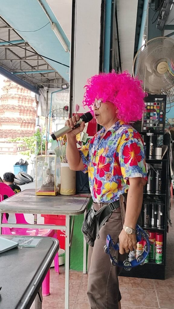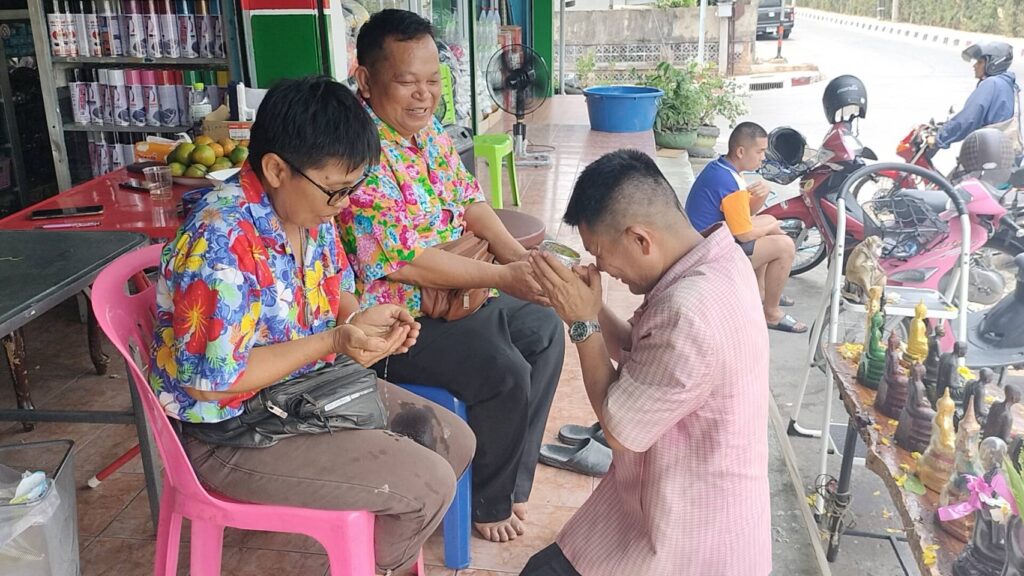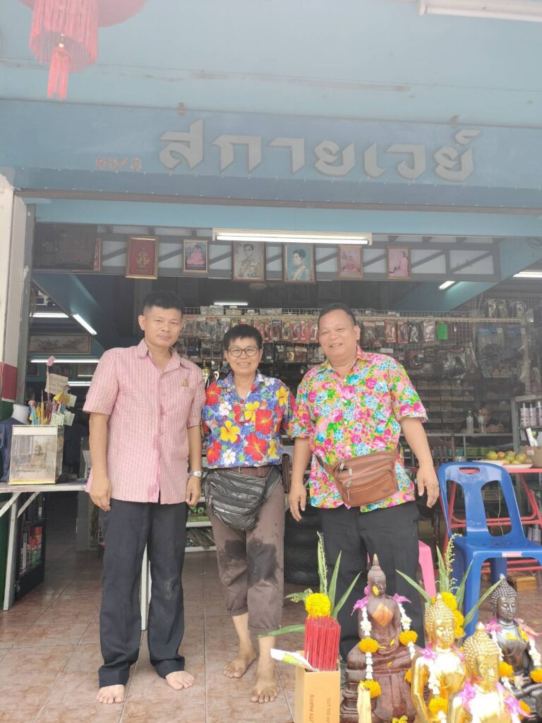 เจ๊กิ่ง เจ้าของร้านสกายเวย์ ได้นั่งเก้าอี้หน้าร้านสกายเวย์ ได้มีพนักงานขายอะไหล่พร้อมด้วยช่างซ่อมมอเตอร์ไซค์ ต่อแถว รดน้ำดำหัว นายศิริชัย อัมพร