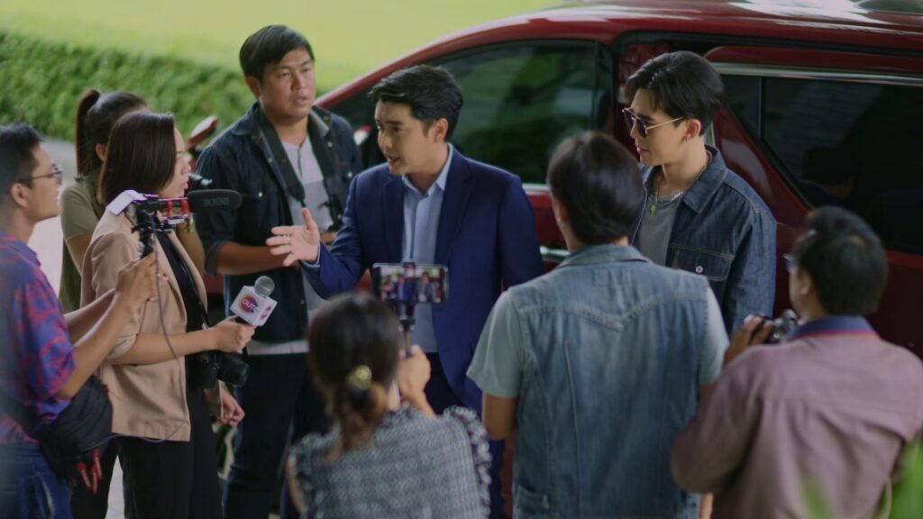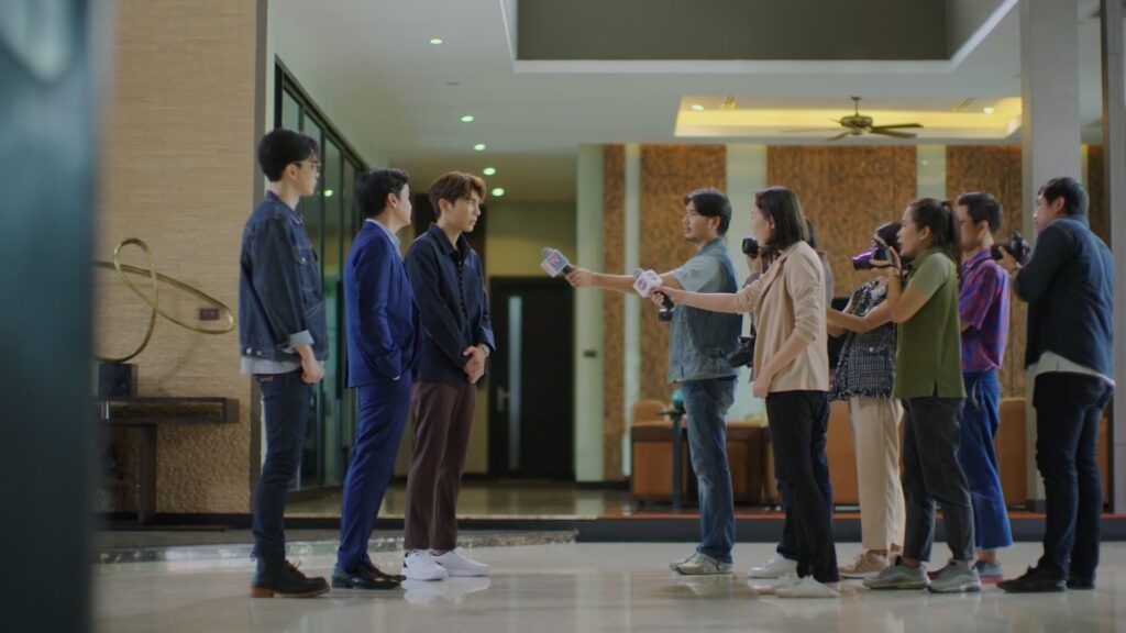มาถึงอีกฉากเป็นฉากที่เมื่อมีข่าวลือ ป๊อปกินเด็กในวงตัวเองออกไป คุณกร ก็เข้ามาจัดการปัญหา ส่วนจิมมี่ก็รีบเสนอตัวเป็นแฟน บี ในทันที สำหรับฉากนี้ใช้บ้านพุทธมณฑล สาย 2 เซ็ทเป็นบ้านพักวง AGA 1 N ซึ่งในฉากนี้มีผู้กำกับ เขตต์ ฐานทัพ ที่สวมบทคุณกร ป๊อป และ จิมมี่ เข้าฉาก พร้อมด้วยเหล่านักแสดงตัวประกอบ5-6 คน มารับบทนักข่าว ทำให้ก่อนถ่ายก็เลยต้องมีการซักซ้อมคิวและจังหวะกับกล้องกันหน่อย และพอเวลาถ่ายทำจริงก็เลยใช้เวลาไม่นาน เพราะเล่นได้ลื่นไหล คุณกร ทำท่าเข้มแต่ดูแล้วมีฮา ส่วนหนุ่มแม้ก ก็ยังเป็นจิมมี่ แอคติ้งสุดโอเวอร์ประกาศให้โลกรู้ว่าฉันเป็นแฟนบีจ้า… ทำเอาพอเสียงคัทดังขึ้น เบื้องหลังเสียงขำกลิ้งกันทั้งกอง ด้านพระเอกของเราหนุ่มมิว ตอนถ่ายฉากนี้เล่นได้ดี จู่ๆก็โดนกลั่นแกล้งซะงั้น เห็นทีต้องมาให้กำลังป๊อปกันอีกแล้ว