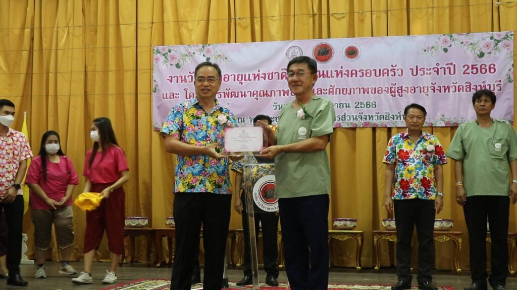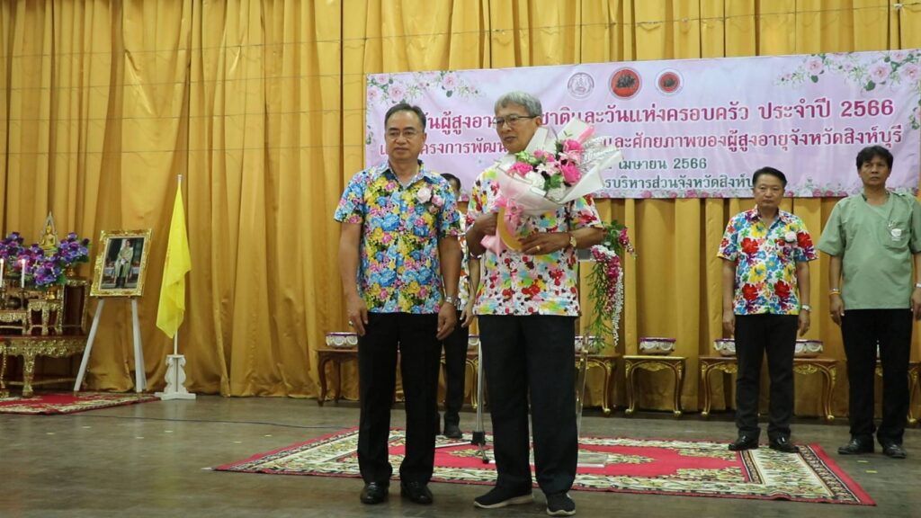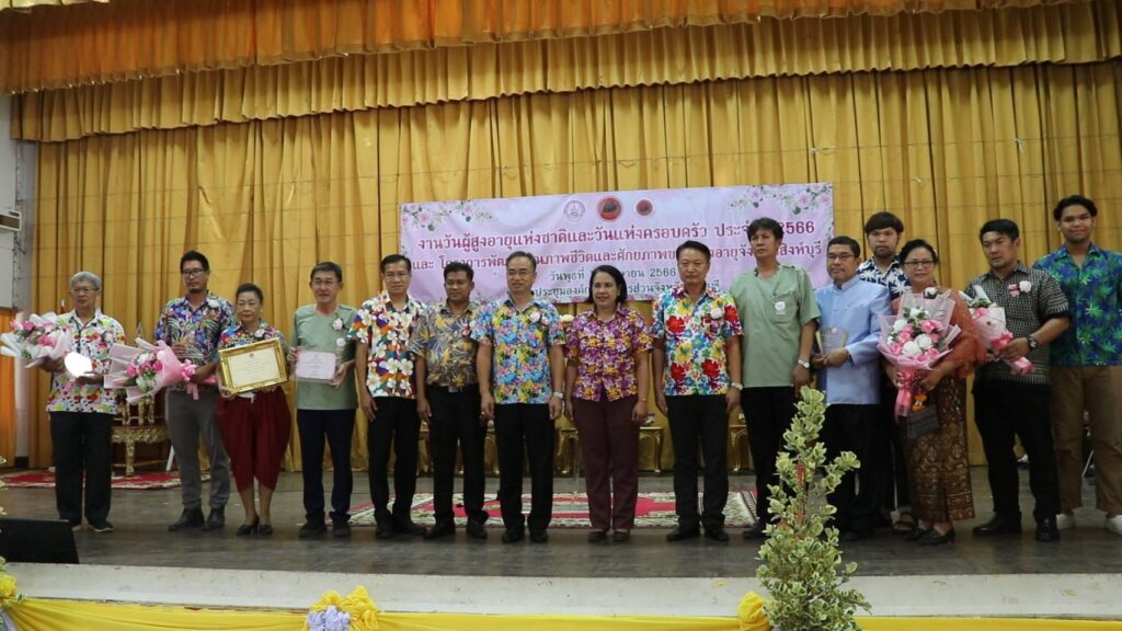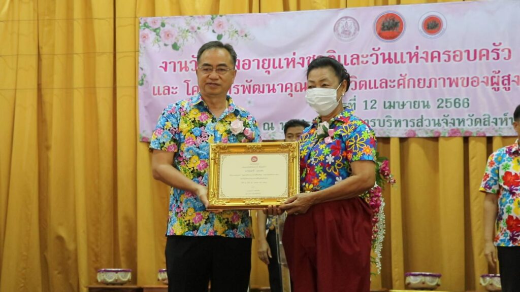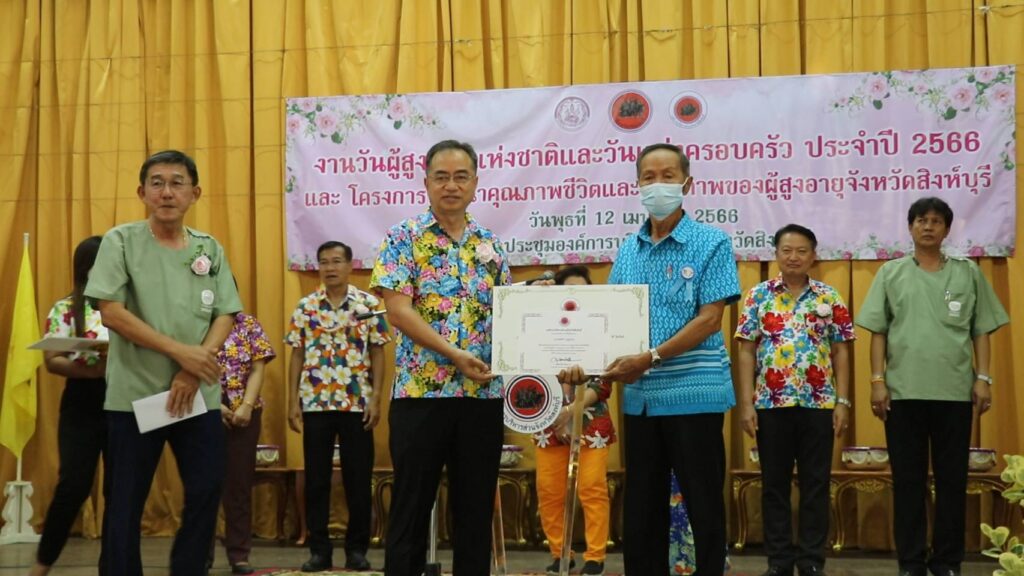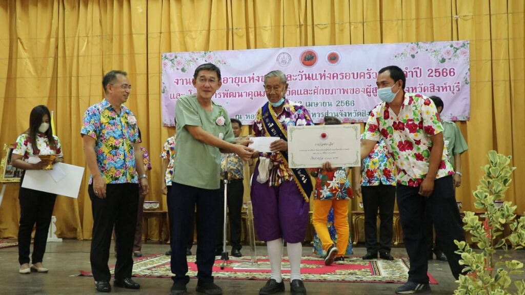 วันที่ 12 เมษายน 2566 เวลา 14.05 น.นายสุพจน์ ยศสิงห์คำ ผู้ว่าราชการจังหวัดสิงห์บุรีเป็นประธานในพิธีมอบโล่รางวัล ใบประกาศเกียรติคุณและช่อดอกไม้ให้แก่ผู้สูงอายุต้นแบบ บุคคลและองค์กรเครือข่ายผู้สูงอายุที่มีผลงานดีเด่นด้านการพัฒนาครอบครัว ในงานวันผู้สูงอายุแห่งชาติและวันครอบครัว ประจำปี 2566 ของ นางสุพัตรา ไพฑูรย์ พัฒนาสังคมและความมั่นคงของมนุษย์จังหวัดสิงห์บุรี และเปิดโครงการพัฒนาคุณภาพชีวิตและศักยภาพของผู้สูงอายุจังหวัดสิงห์บุรี ของ นายศุภวัฒน์ เทียนถาวร นายกองค์การบริหารส่วนจังหวัดสิงห์บุรี และองค์กรด้านผู้สูงอายุของจังหวัดสิงห์บุรี จัดกิจกรรม ฒ.แข็งแรงประจำเดือนเมษายน โดยการรดน้ำขอพรผู้สูงอายุ ซึ่งประกอบด้วย เครือข่ายผู้สูงอายุทั้ง 6 อำเภอ ชมรมผู้อายุจังหวัดสิงห์บุรี สมาคมศูนย์ประสานงานภาคเอกชนจังหวัดสิงห์บุรี และชมรมคลังปัญญาผู้สูงอายุจังหวัดสิงห์บุรี โดยมีวัตถุประสงค์เพื่อส่งเสริมให้ทุกภาคส่วนตระหนักถึงคุณค่าและความสำคัญของผู้สูงอายุ เสริมสร้างความสัมพันธ์ ของสมาชิกครอบครัวรวมทั้งยกย่องเชิดชูเกียรติครอบครัวและบุคคลที่ได้รับการคัดเลือกให้เป็นแบบอย่างด้านการพัฒนาสถาบันครอบครัวและกระตุ้นให้ประชาชนและสังคมตระหนักถึงวันสำคัญของครอบครัว