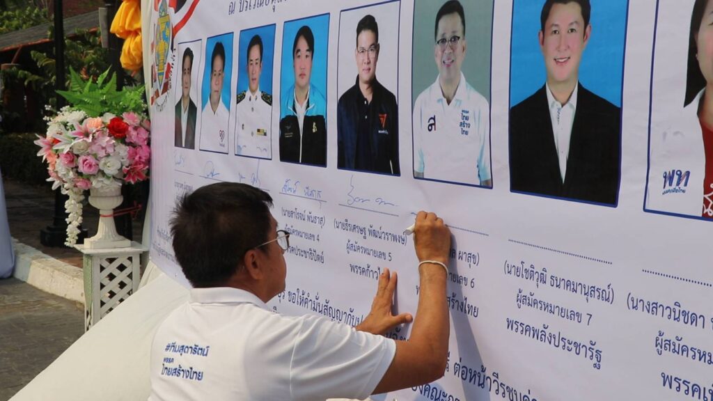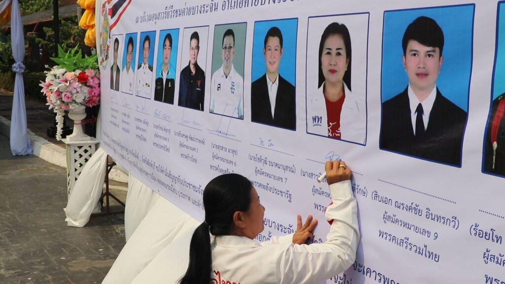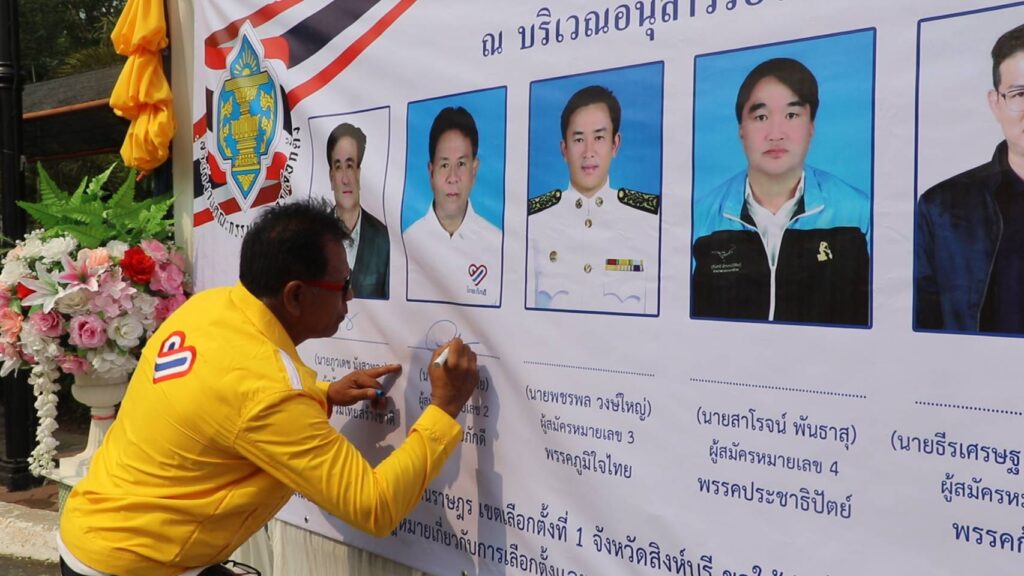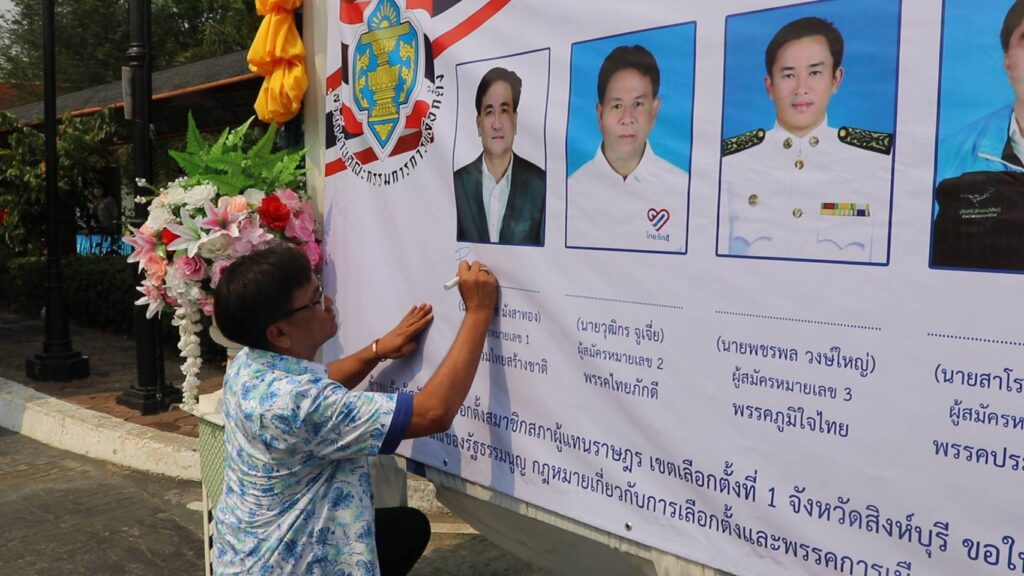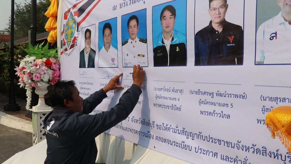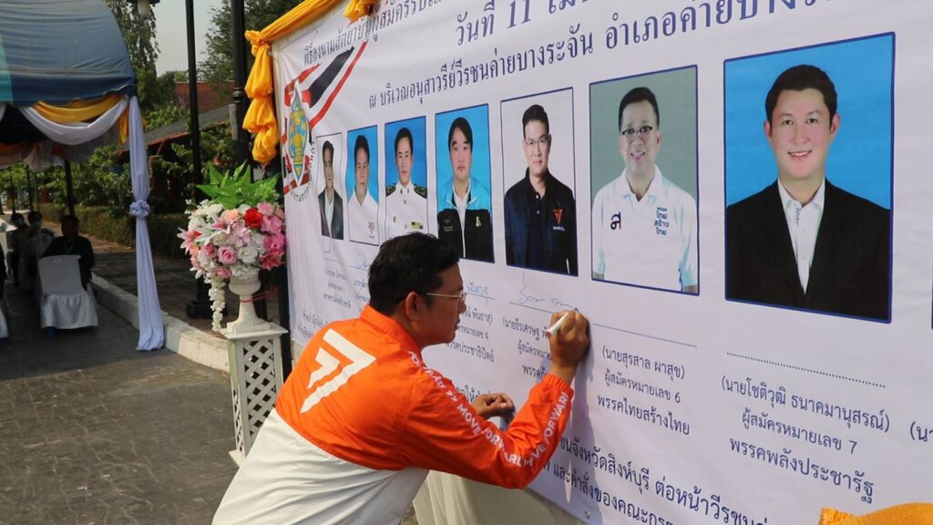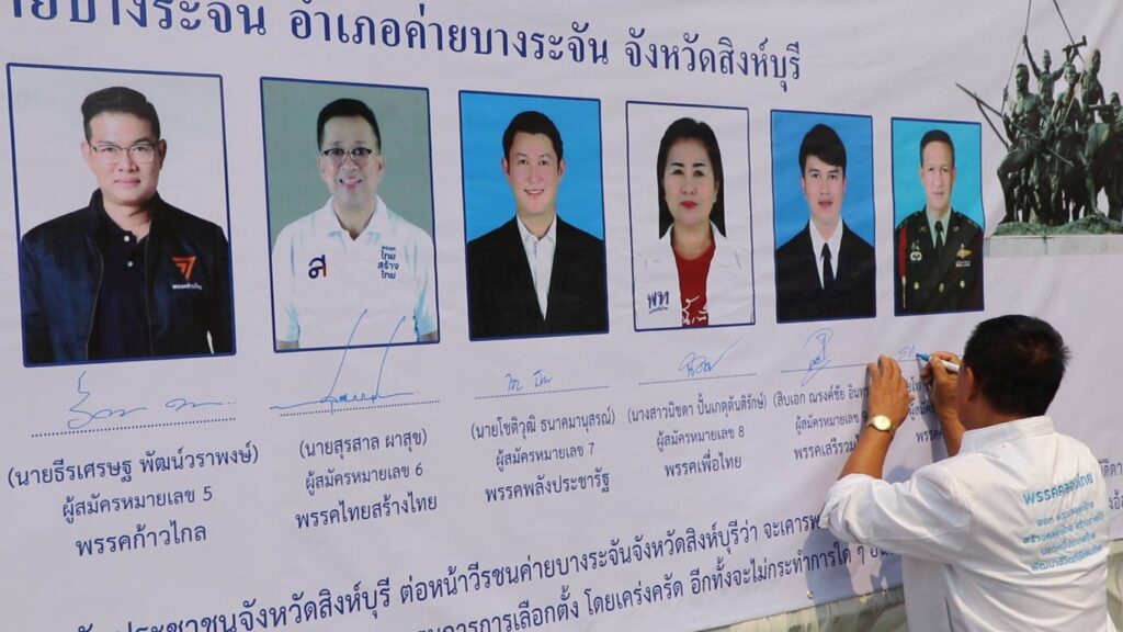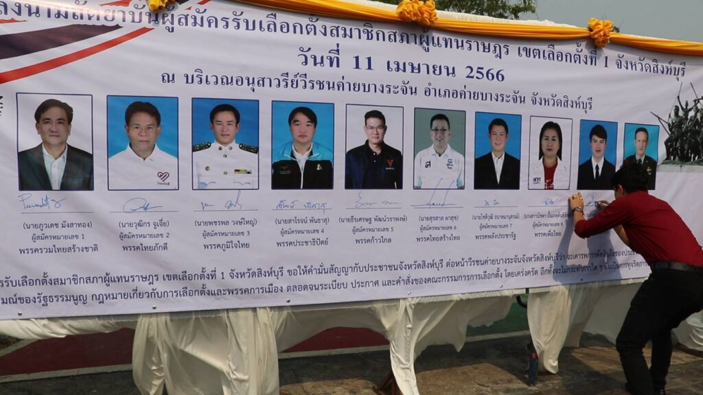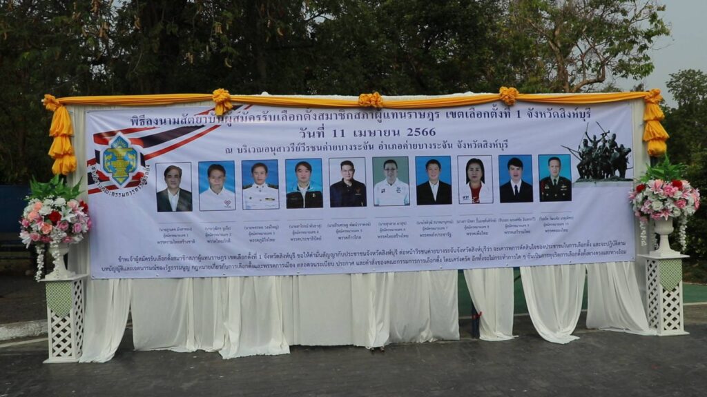 วันที่ 11 เมษายน 2566 เวลา 9.00 น.นายสุพจน์ ยศสิงห์คำ ผู้ว่าราชการจังหวัดสิงห์บุรี เป็นประธานวางพวงมาลา อนุสาวรีย์วีรชนค่ายบางระจัน แล้วนำผู้สมัครรับเลือกตั้งสมาชิกสภาผู้แทนราษฏร เขตเลือกตั้งที่ 1 จังหวัดสิงห์บุรี จำนวน 10 พรรค กล่าวถวายคำสัตย์ปฏิฏาณและลงนามสัตยาบัน ให้คำมั่นสัญญากับประชาชนจังหวัดสิงห์บุรี ต่อหน้าวีรชนค่ายบางระจันจังหวัดสิงห์บุรีว่า จะเคารพการตัดสินใจของประชาชนในการเลือกตั้งและจะปฏิบัติตามบทบัญญัติและเจตนารมณ์ของรัฐธรรมนูญ กฏหมายเกี่ยวกับการเลือกตั้งและพรรคการเมือง ตลอดจนระเบียบประกาศและคำสั่งของคณะกรรมการการเลือกตั้ง โดยเคร่งครัด อีกทั้งจะไม่กระทำการใดๆอันเป็นการทุจริตการเลือกตั้งทั้งทางตรงและทางอ้อม โดยมีนายกฤษเรศ วังทะพันธ์ ผู้ตรวจการสำนักงานคณะกรรมการการเลือกตั้ง เขตตรวจการที่ 1 นางสาวชุลีพร ชาญใบพัด ผู้อำนวยการการเลือกตั้งประจำจังหวัดสิงห์บุรี นายปัญญา ใช้เฮ็ง นายอำเภอเมืองสิงห์บุรีในฐานะประธานกรรมการการเลือกตั้งประจำเขตเลือกตั้งที่ 1 จังหวัดสิงห์บุรี และคณะกรรมการการเลือกตั้งประจำเขตเลือกตั้ง จังหวัดสิงห์บุรี ร่วมเป็นสักขีพยานในการกล่าวถวายคำสัตย์ปฏิฏาณและลงนามสัตยาบัน อีกด้วย