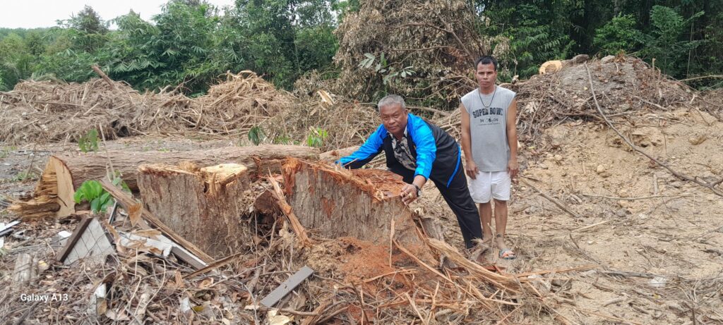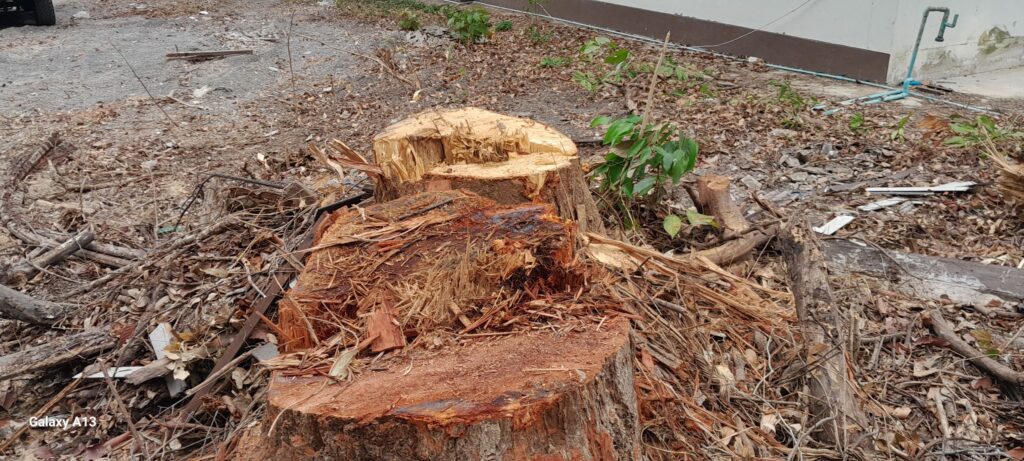 ส่วนไม้ยางถูกตัดเป็นท่อนๆทิ้งไว้ ยังไม่ถูกชักลากออกไป