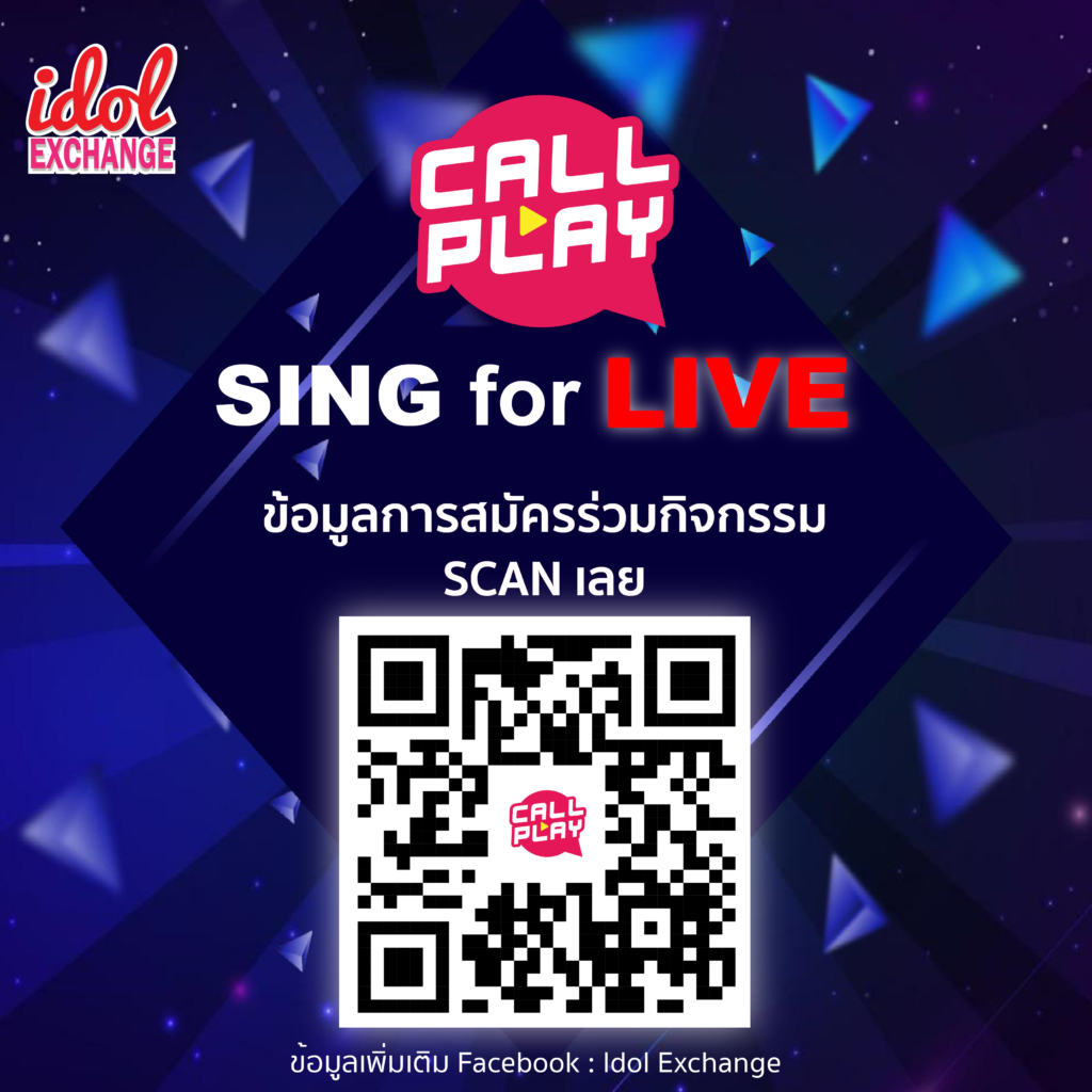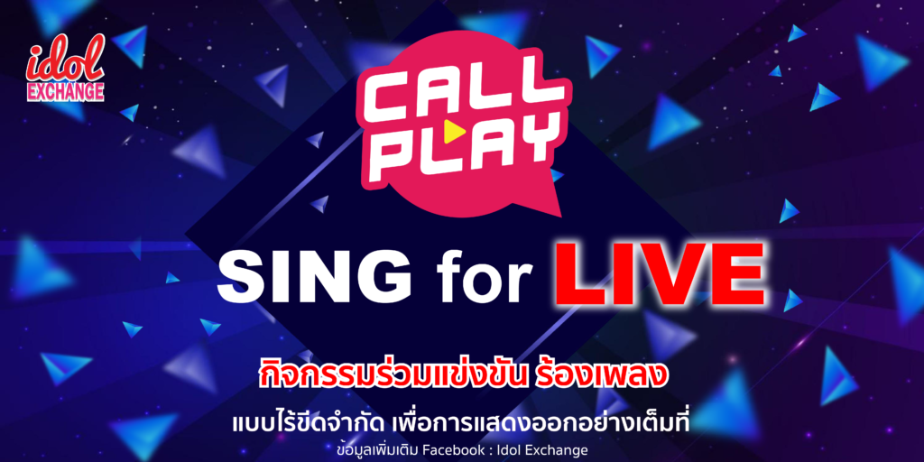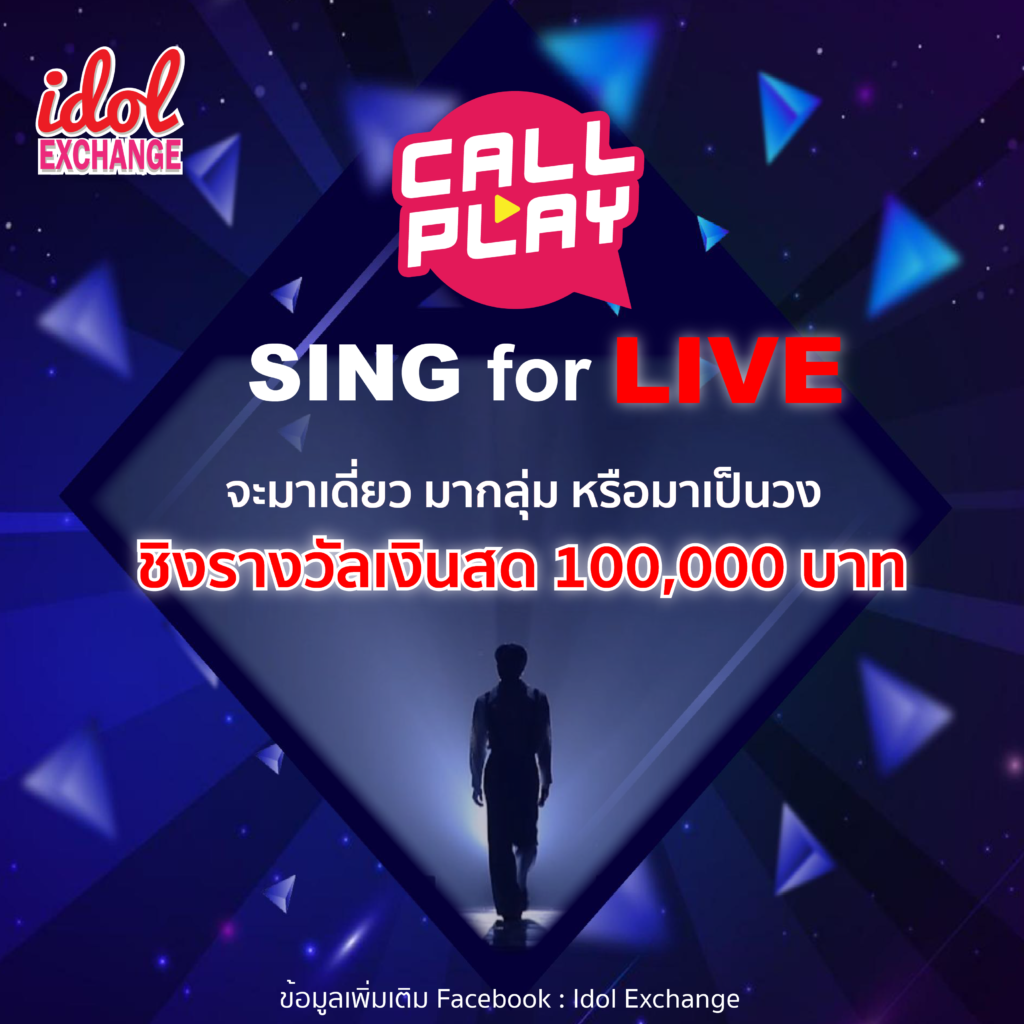 หลังจากจัดกิจกรรม Idol Exchange เพื่อสนับสนุนน้องๆศิลปิน และไอดอลมาตลอด 3 ปีที่ผ่านมา ครั้งนี้เพื่อตอกย้ำ วงการ T-PoP อย่างต่อเนื่อง คุณกุ้ง ศรุดา นิ่มพิทักษ์พงศ์ ผู้บริหาร Idol Exchange และ IDX Entertainment ได้จับมือกับ Call Play Application สำหรับคนรุ่นใหม่ ร่วมจัดกิจกรรมแข่งขันร้องเพลง CALL PLAY SING for LIVE แบบไร้ขีดจำกัด เพื่อการแสดงออกอย่างเต็มที่ ชิงรางวัล เงินสด 100,000 บาท และของรางวัลอีกมากมาย เพื่อผลักดันและสนับสนุนคนรุ่นใหม่ให้กล้าแสดงออกและทำในสิ่งที่ตัวเองรัก และอาจจะมีโอกาสเข้าสู่วงการบันเทิงอีกด้วย