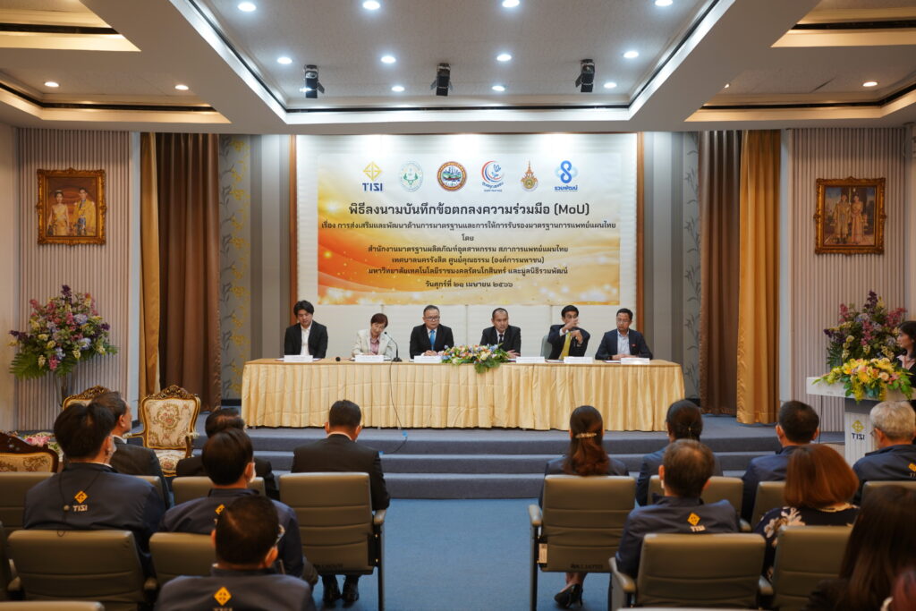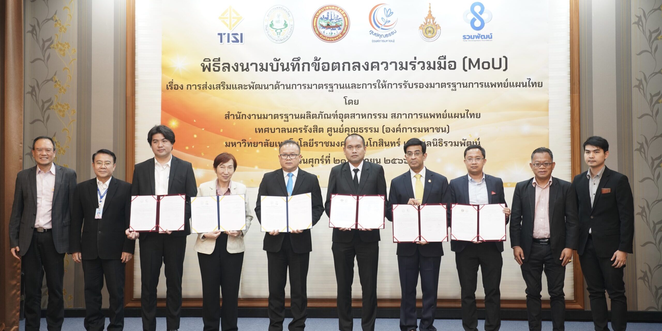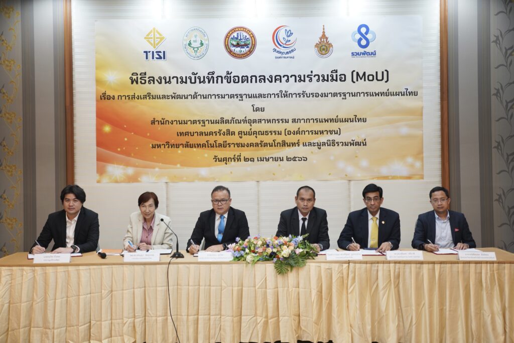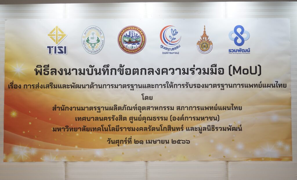 ภายในพิธีลงนามมี นายบรรจง สุกรีฑา เลขาธิการสำนักงานมาตรฐานผลิตภัณฑ์อุตสาหกรรม พท.ดร. ชนิญญา ชัยสุวรรณ นายกสภาการแพทย์แผนไทย ร.ต.อ. ดร.ตรีลุพธ์ ธูปกระจ่าง นายกเทศมนตรีนครรังสิต อาจารย์ สถิตเทพ สังข์ทอง ผู้แทนมหาวิทยาลัยเทคโนโลยีราชมงคลรัตนโกสินทร์ ร่วมลงนามบันทึกข้อตกลงความร่วมมือในครั้งนี้
