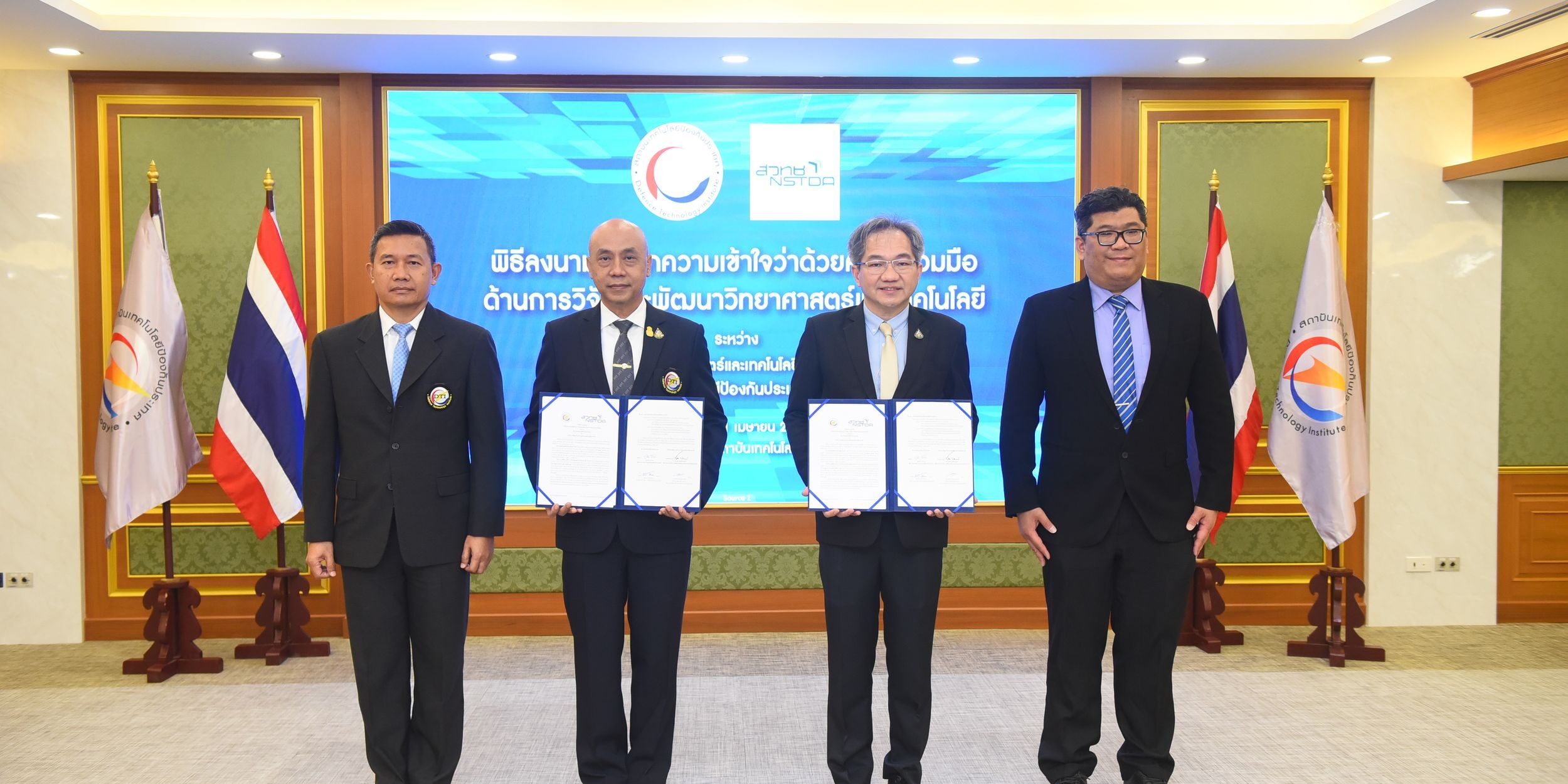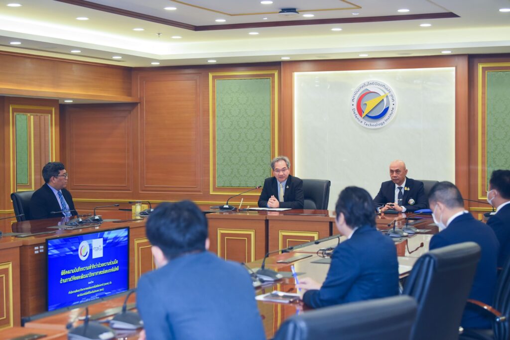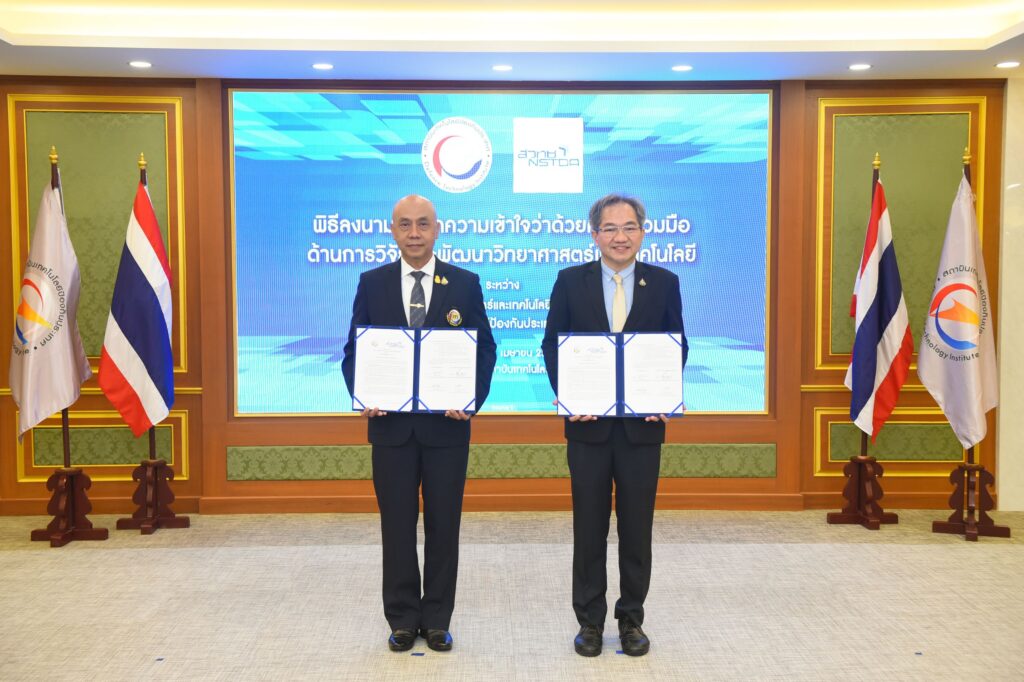วันที่ 21 เมษายน 2566 ณ สถาบันเทคโนโลยีป้องกันประเทศ : กระทรวงการอุดมศึกษา วิทยาศาสตร์ วิจัยและนวัตกรรม (อว.) สำนักงานพัฒนาวิทยาศาสตร์และเทคโนโลยีแห่งชาติ (สวทช.) โดยศูนย์เทคโนโลยีเพื่อความมั่นคงของประเทศและการประยุกต์เชิงพาณิชย์ ร่วมกับสถาบันเทคโนโลยีป้องกันประเทศ (สทป.) ลงนามความบันทึกความเข้าใจว่าด้วยความร่วมมือด้านการวิจัยและพัฒนาวิทยาศาสตร์และเทคโนโลยี โดยทั้งสองหน่วยงานสนับสนุนความเชี่ยวชาญ ของบุคลากรและการสนับสนุนทรัพยกรงานวิจัยร่วมกัน โดยมีพลเอกชูชาติ บัวขาว ผู้อำนวยการสถาบันเทคโนโลยีป้องกันประเทศ (สทป.) และศาสตราจารย์ ดร.ชูกิจ ลิมปิจำนงค์ ผู้อำนวยการสำนักงานพัฒนาวิทยาศาสตร์และเทคโนโลยีแห่งชาติ (สวทช.) ร่วมลงนาม พลตรีพีรพงศ์ โพธิ์เหมือน รองผู้อำนวยการ (สปท.) และดร.อดิสร เตือนตรานนท์ ผู้ช่วยผู้อำนวยการ (สวทช.) ร่วมเป็นพยาน ทั้งนี้ความร่วมมือดังกล่าวเพื่อสร้างองค์ความรู้ การใช้เทคโนโลยี และกิจกรรมนวัตกรรมเทคโนโลยีสองทางทุกรูปแบบ อีกทั้งรัฐบาลมีนโยบายในการผลักดันให้อุตสาหกรรมเทคโนโลยีป้องกันประเทศ เป็น S-Curve ตัวที่ 11 โดยกระทรวงการอุดมศึกษา วิทยาศาสตร์ วิจัย และนวัตกรรม รับผิดชอบในการส่งเสริมและวิจัยพัฒนาเทคโนโลยีสองทาง (Dual-Use) ที่สร้างขีดความสามารถให้มีการใช้งานได้ทั้งในภารกิจด้านความมั่นคงและสำหรับภาคพลเรือนทั่วไปเชิงพาณิชย์