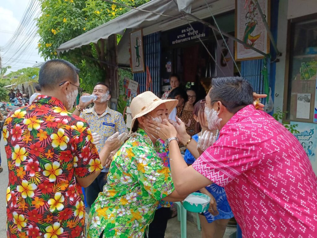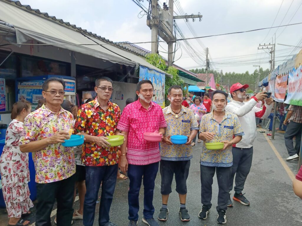 ในงานยังมรอการเล่นน้ำสงกรานต์ปะแป้งสาดน้ำให้อย่างคึกคักทำให้อากาศร้อนหายสดชื่นกันไปทั้งหมู่บ้าน