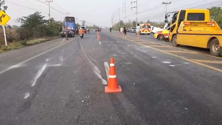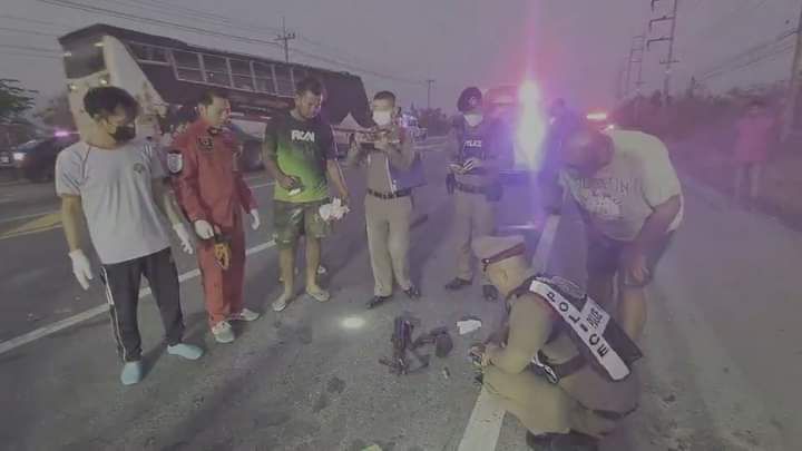 จากการสอบสวนของเจ้าหน้าที่เบื้องต้น ได้ความว่า รถกระบะคันสีขาว ขับมาด้วยความเร็วแล้วเสียหลักพุ่งเข้าชนรถบัสคนงานฯ ในช่องทางของรถบัส (ช่องด้านในสุด) เมื่อตรวจสอบที่เกิดเหตุ พบยาไอซ์จำนวน 1 ถุงใหญ่ 3 ถุงเล็ก ยาบ้า จำนวน 24 เม็ด อาวุธปืนอาก้าพับฐาน 1 กระบอก ปืนสั้น 1 กระบอก พร้อมด้วยลูกกระสุน จำนวนหนึ่ง นอกจากนี้ภายในรถกะบะมีผู้ได้รับบาดเจ็บอาการสาหัสอีก 1 ราย คือนายศรายุทธ กงฉายา ที่นั่งมาด้วยอยู่เบาะข้างคนขับและพกปืนอาก้าไว้กับตัว จึงนำตัวส่งรักษาที่โรงพยาบาล สำหรับสาเหตุของการเกิดอุบัติเหตุ คาดว่าเกิดจากสภาพถนนที่เปียกลื่นเนื่องจากมีฝนตกในพื้นที่ รายชื่อผู้เสียชีวิต