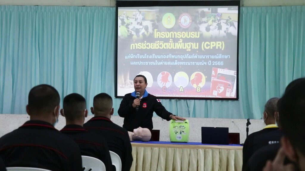 ศูนย์สงครามพิเศษ จัดทีมวิทยากร นำโดย พันโทหญิง โชนรังษี ขำสกุล ผู้บังคับหน่วยตรวจโรค ศูนย์สงครามพิเศษ พร้อมด้วย พันตรี นิพนธ์ โคกกะเทียมค่ะ รองผู้บังคับหน่วยตรวจโรค ศูนย์สงครามพิเศษ จัดการฝึกอบรมการช่วยชีวิตขั้นพื้นฐาน สำหรับประชาชน (CPR) และ การใช้เครื่องกระตุกหัวใจไฟฟ้าอัตโนมัติ (AED) ให้แก่กำลังพลที่ปฏิบัติงานภายในหน่วยขึ้นตรง ภายในค่ายสมเด็จกระนารายณ์มหาราช จำนวน 171 นาย ณ แหล่งชุมนุมทหารรบพิเศษ 1 ค่ายสมเด็จพระนารายณ์มหาราช อ.เมือง จ.ลพบุรี เพื่อให้กำลังพลของหน่วยได้มีความรู้ในการช่วยชีวิตขั้นพื้นฐาน (CPR) และสามารถใช้เครื่องกระตุกหัวใจไฟฟ้าอัตโนมัติ (AED) ได้อย่างถูกวิธี สามารถนำความรู้ไปขยายผลให้กับกำลังพลในหน่วยของตนเองได้อย่างมีประสิทธิภาพ ซึ่งกำลังพลที่เข้ารับการฝึกอบรมจะได้รับความรู้ทั้งทางทฤษฎี และการปฏิบัติจริง เพื่อให้เกิดความชำนาญในการช่วยชีวิตเบื้องต้น หากเกิดเหตุการณ์ฉุกเฉินขึ้น