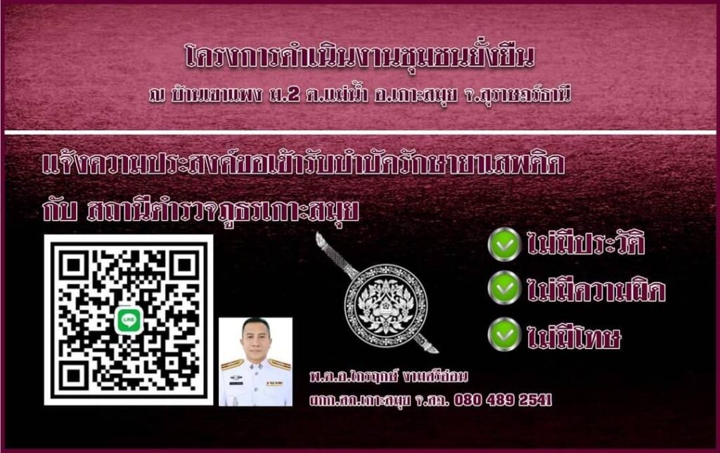 ชุดปฏิบัติการชุมชนยั่งยืน สภ.เกาะสมุย นำโดย พ.ต.ท.สุเมธ สวัสดี สวป.ฯ ร่วมกับคณะกรรมการชุมชน , อสม. , อส.ตร. และ รพ.สต.แม่น้ำ ได้ดำเนินการในขั้นตอน ที่ 2 (ขั้นการบำบัด) โดยในวันนี้ได้ดำเนินการดังนี้