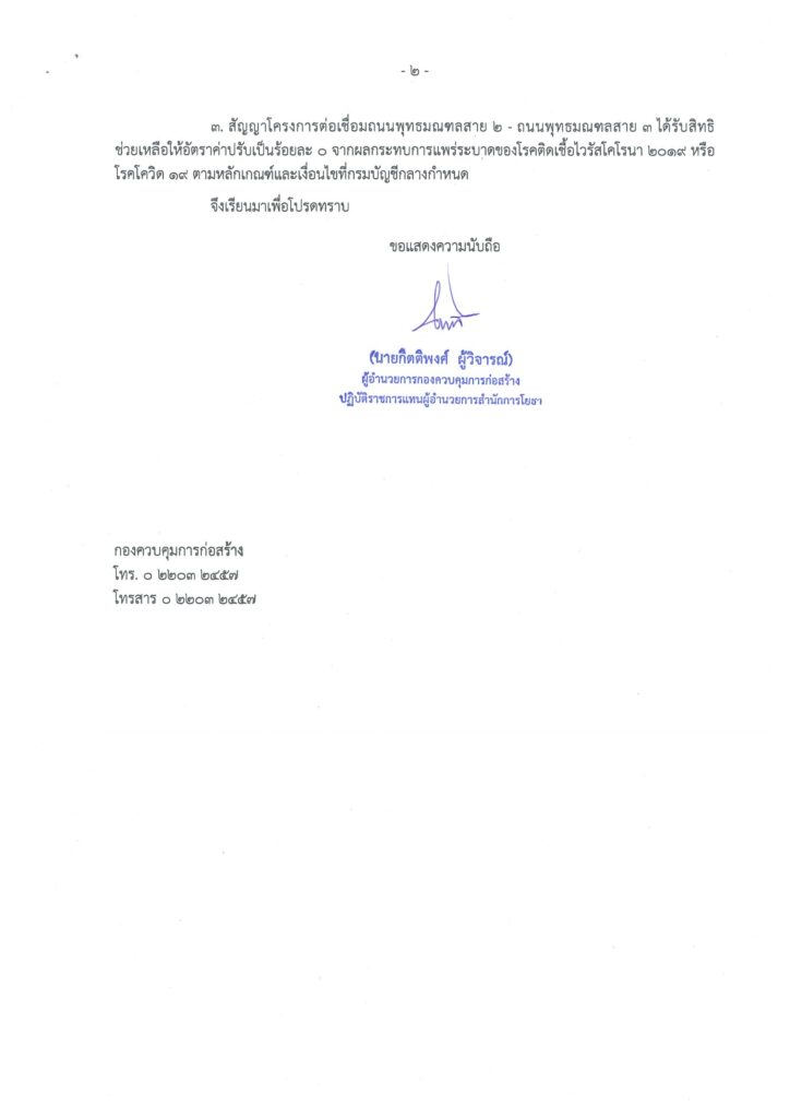 - สัญญาโครงการต่อเชื่อมถนนพุทธมณฑลสาย 2 -3 ได้รับสิทธิ ช่วยเหลือให้อัตราค่าปรับเป็นร้อยละ 0 จากผลกระทบการแพร่ระบาดของโรคติดเชื้อโควิด-19 ตามหลักเกณฑ์และเงื่อนไขที่กรมบัญชีกลางกำหนด